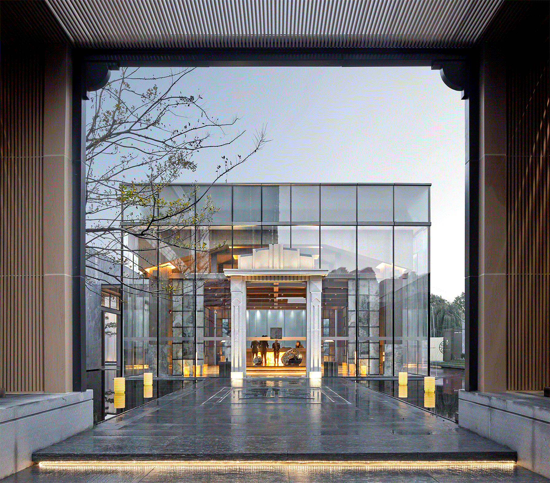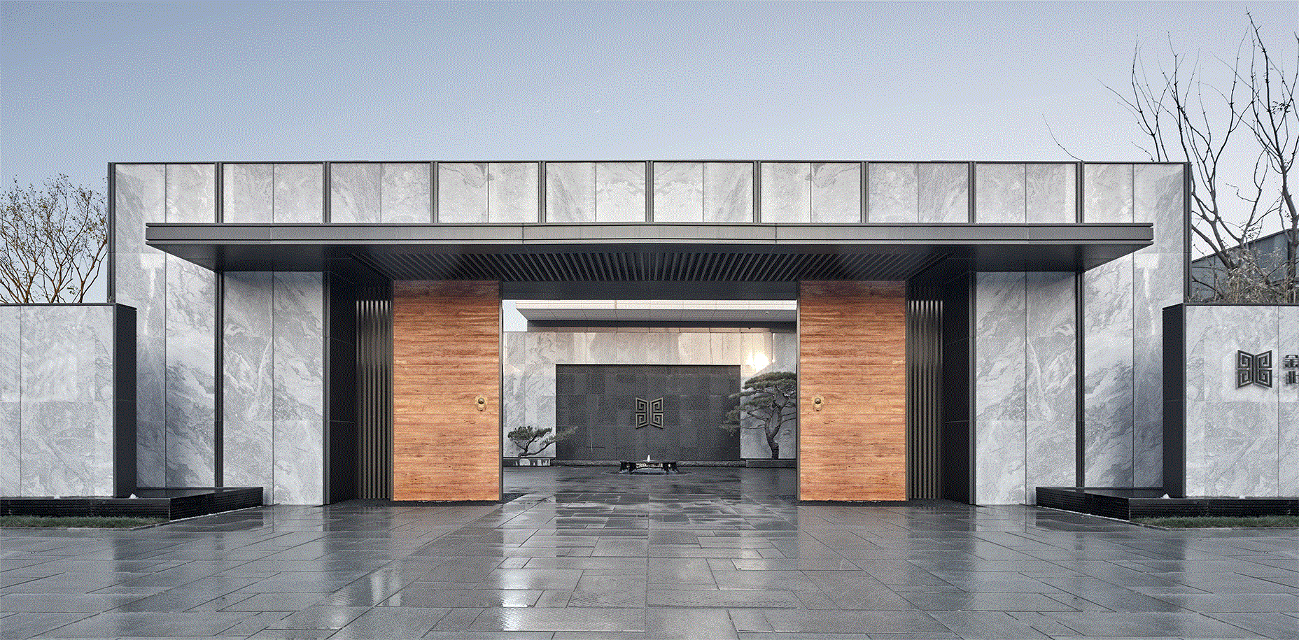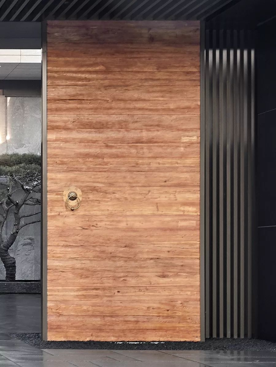 入口采用开放式的设计手法,展示以建筑为主导的后院空间,中式老原木大开门迎接来客,戏台、石院、车马院的组合使人置身历史与现实之间。