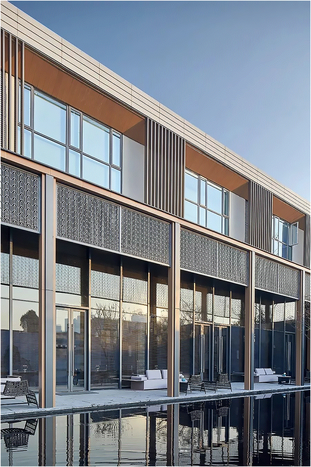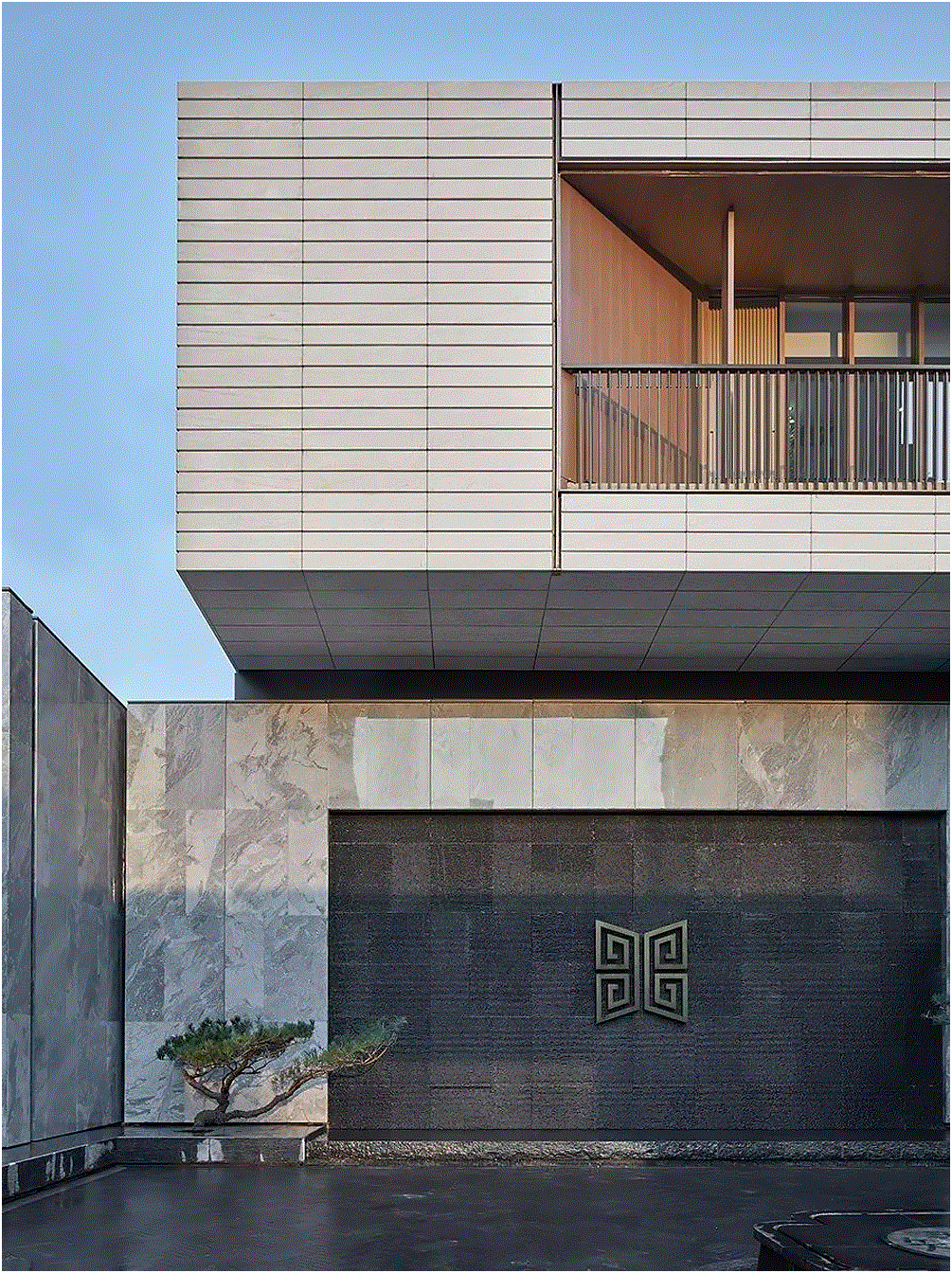 梅,傲霜斗雪、凌寒绽开,乃武汉市花,经过几何抽象化的提炼,梅花以窗格方正的姿态呈现。“唯吾知足” 即知足者常乐,最早出现在汉朝的古钱币上,饱含中国古代人民朴素的心愿、寄托和追求,构思巧妙且寓意深刻。两大元素糅合重造,在建筑物大背景的衬托下独具天地自然之感。