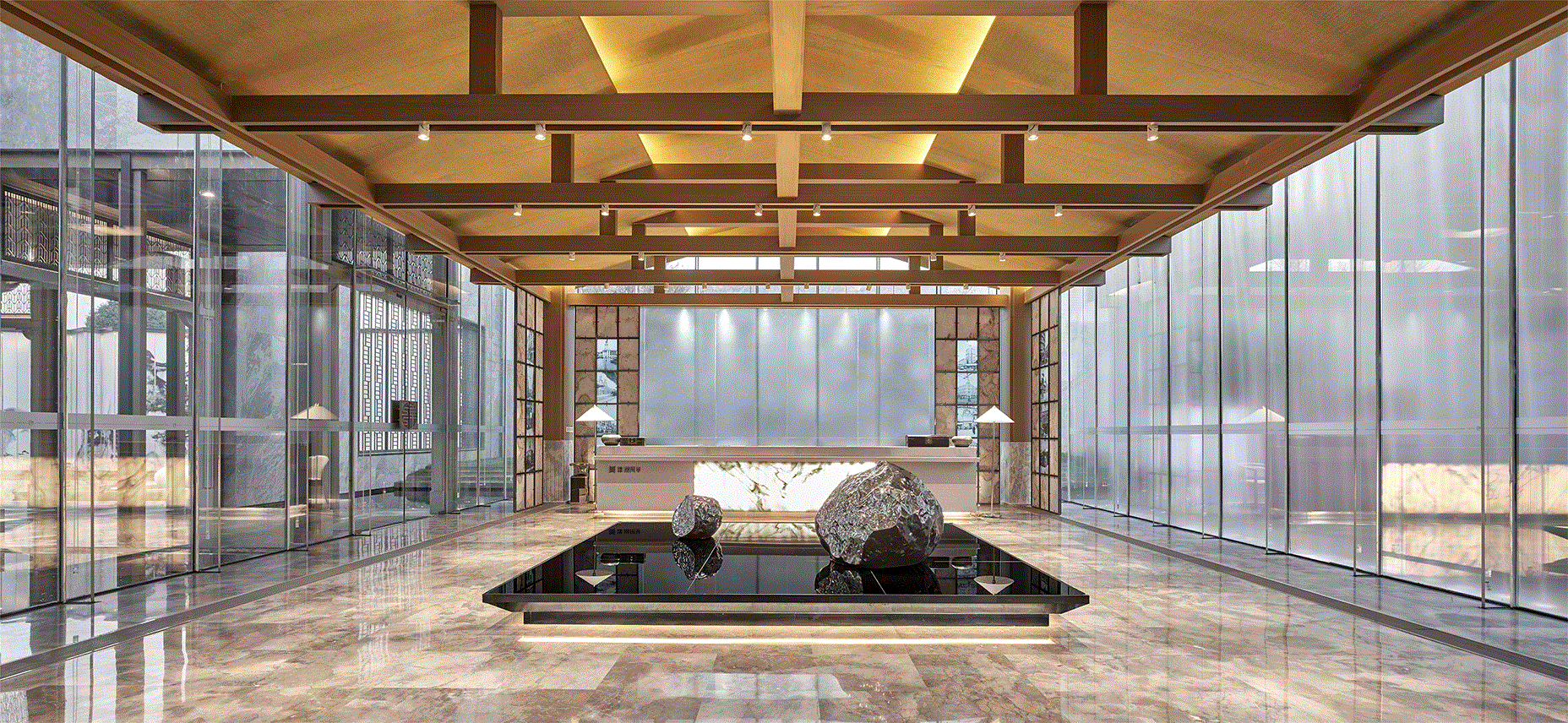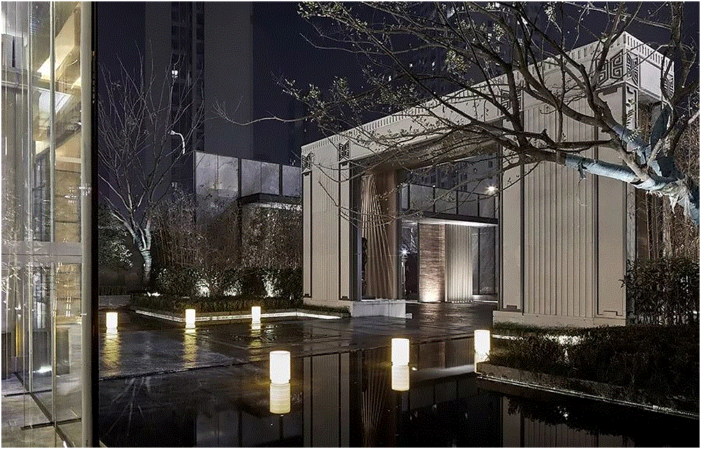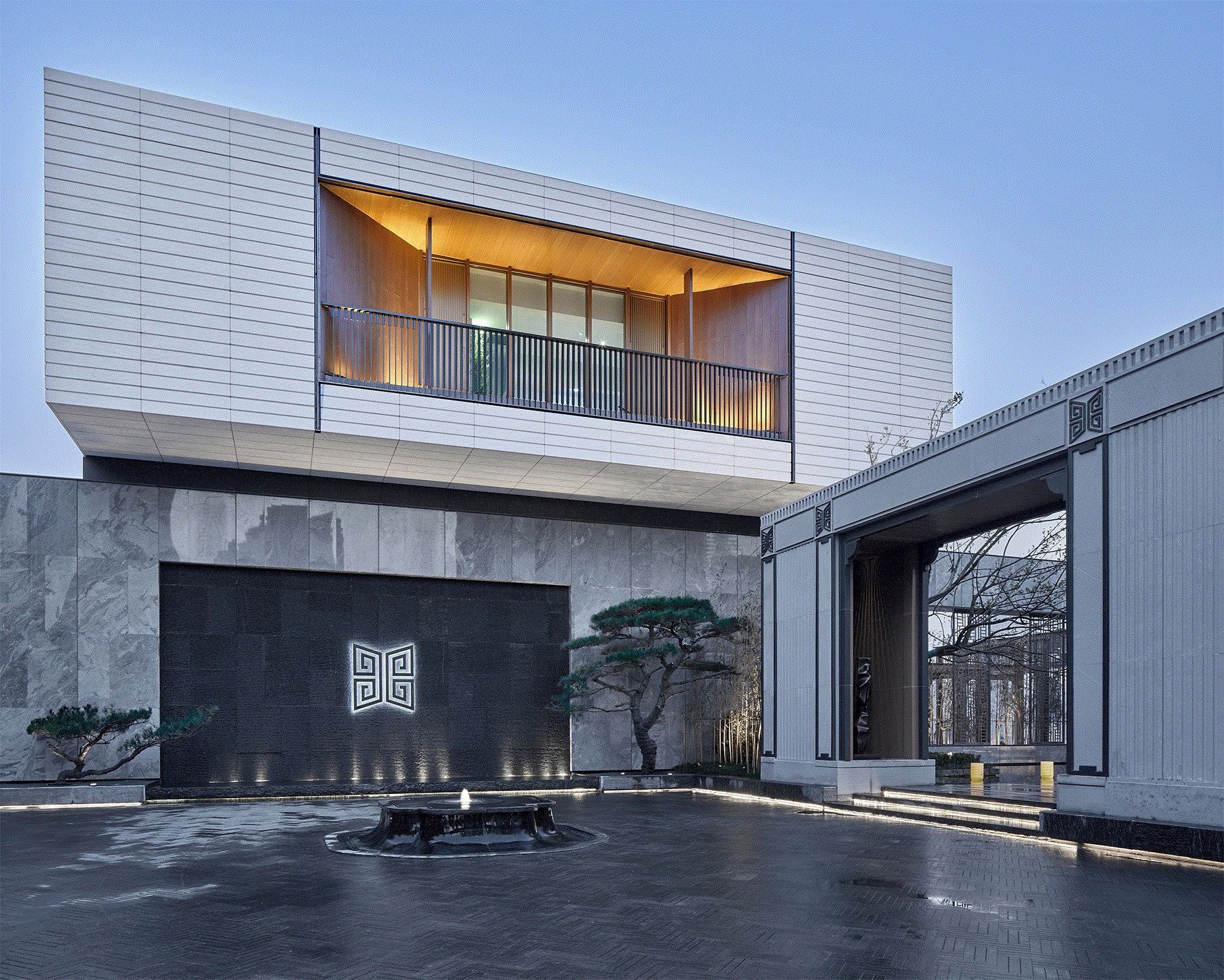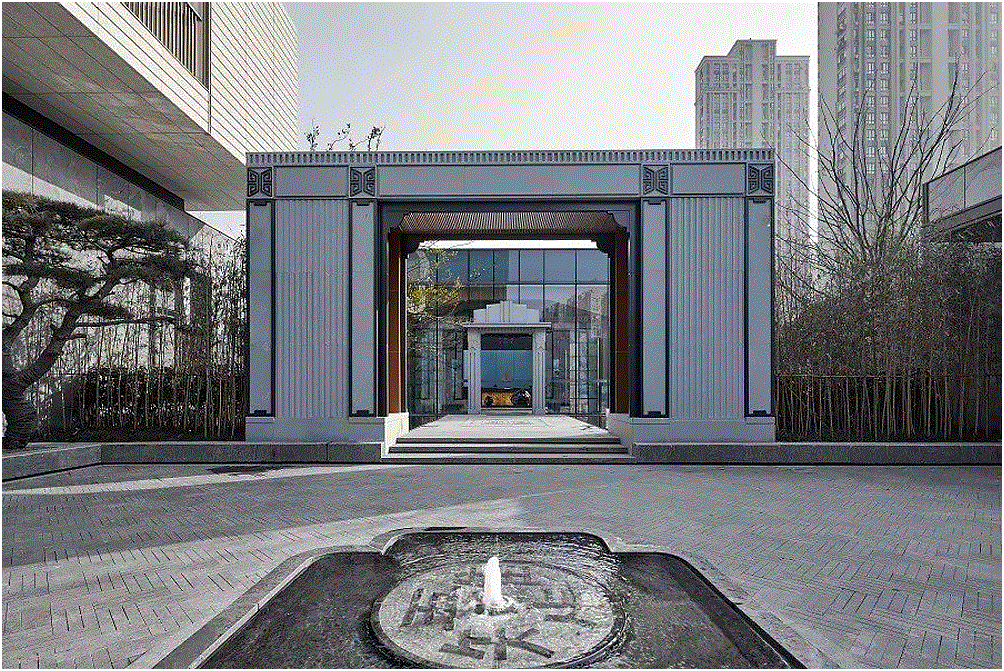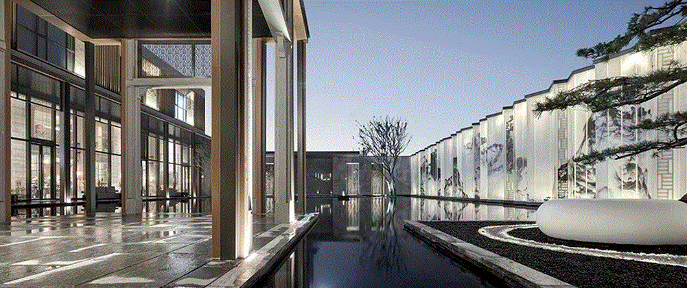 入口处水景的处理,泉映百川,包容大方。内院,我们借由距离之势,打造日照千峰的朦胧景象,石台渐高,日光散落,情景共生。