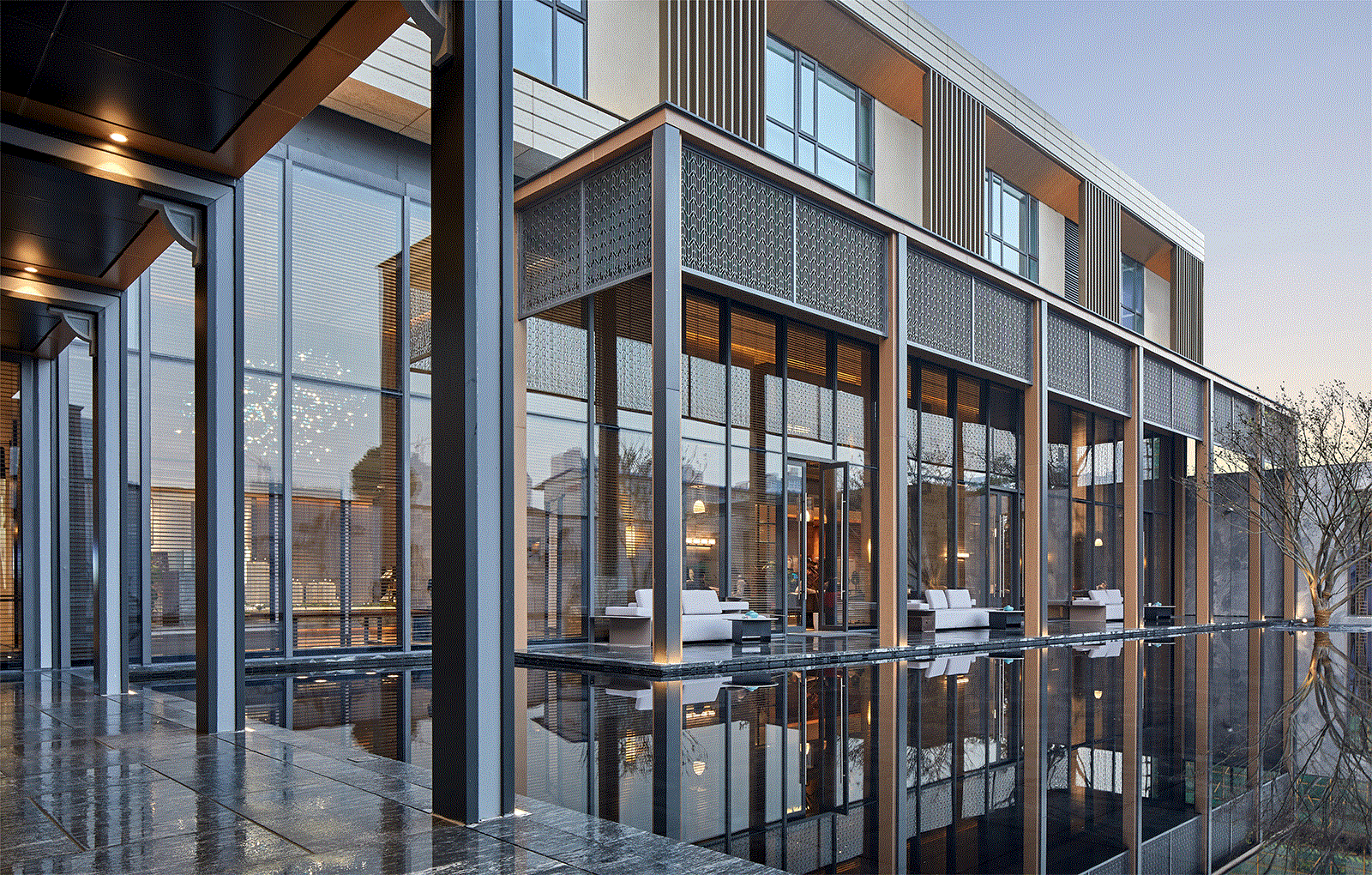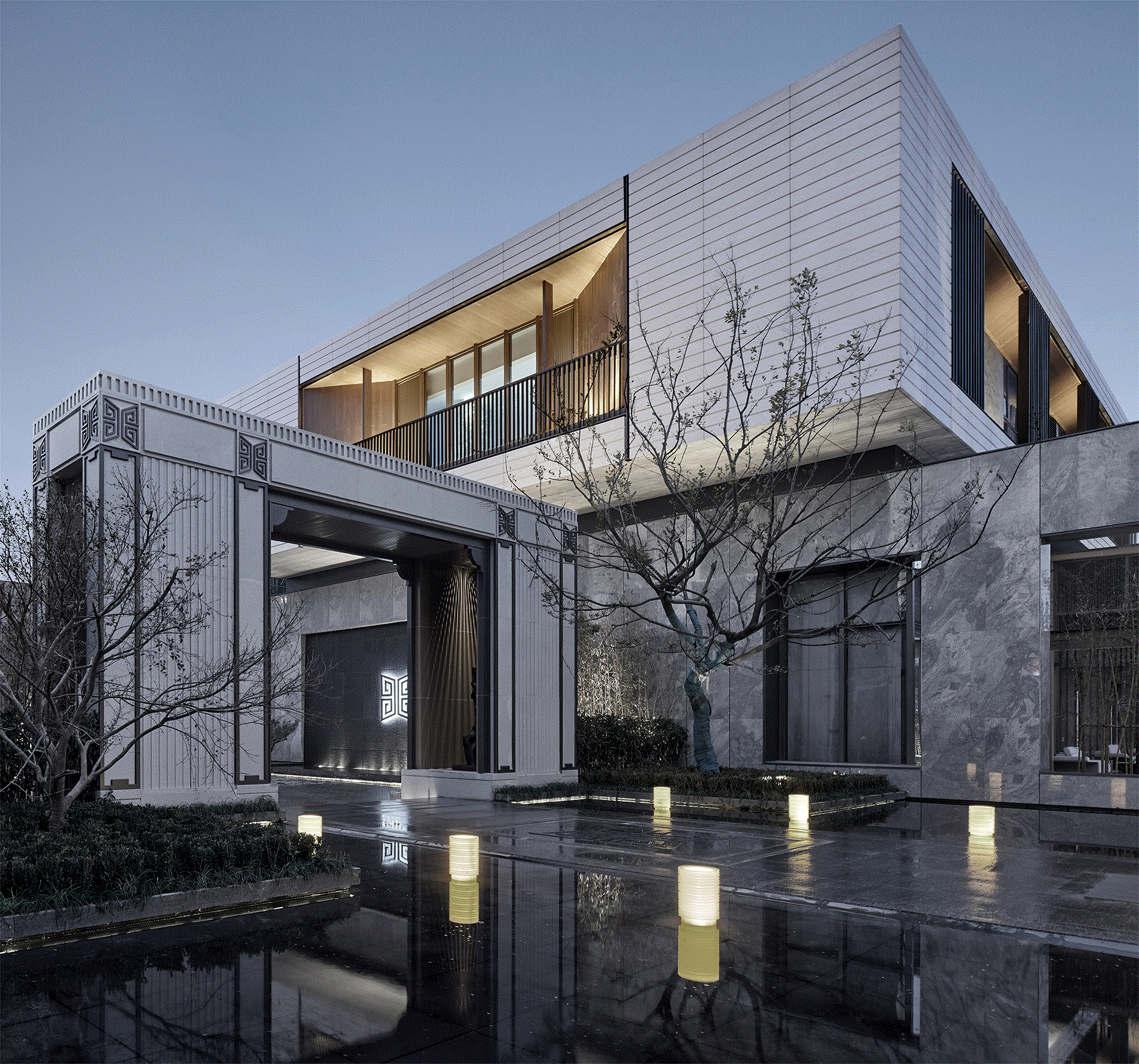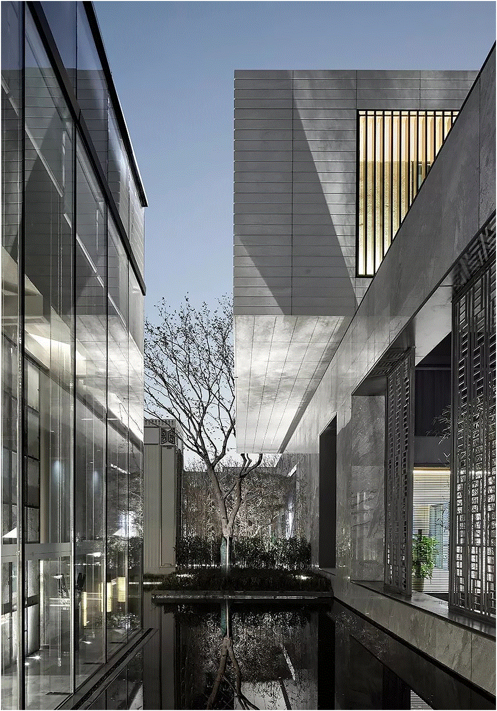 入口处水景的处理,泉映百川,包容大方。内院,我们借由距离之势,打造日照千峰的朦胧景象,石台渐高,日光散落,情景共生。