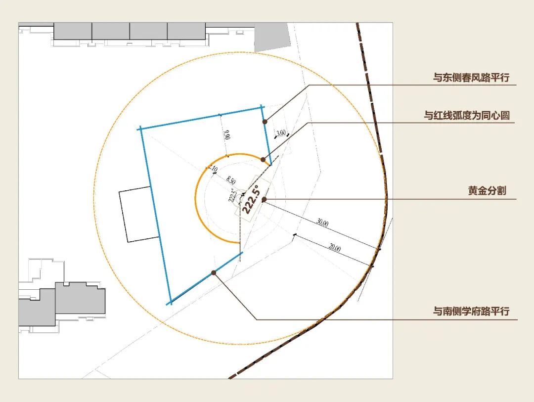 为了更好的回应周边的文体资源,示范区最终选择东南角。借势提炼图书馆形体的设计元素,并重新梳理线性美学的关系,按照黄金分割线比例重新建构。