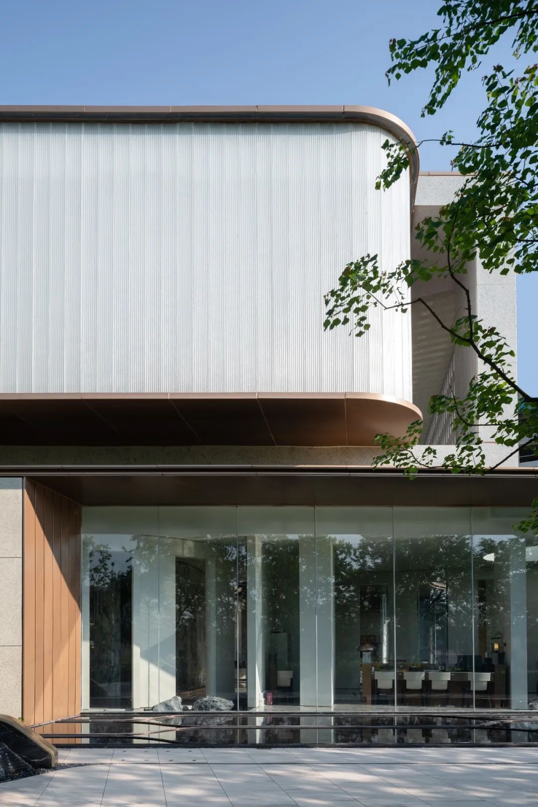 与首层极致的通透玻璃形成对比,放眼到整体则形成了建筑的透明到不透明的渐变,使得空间获得了新的质感与张力。