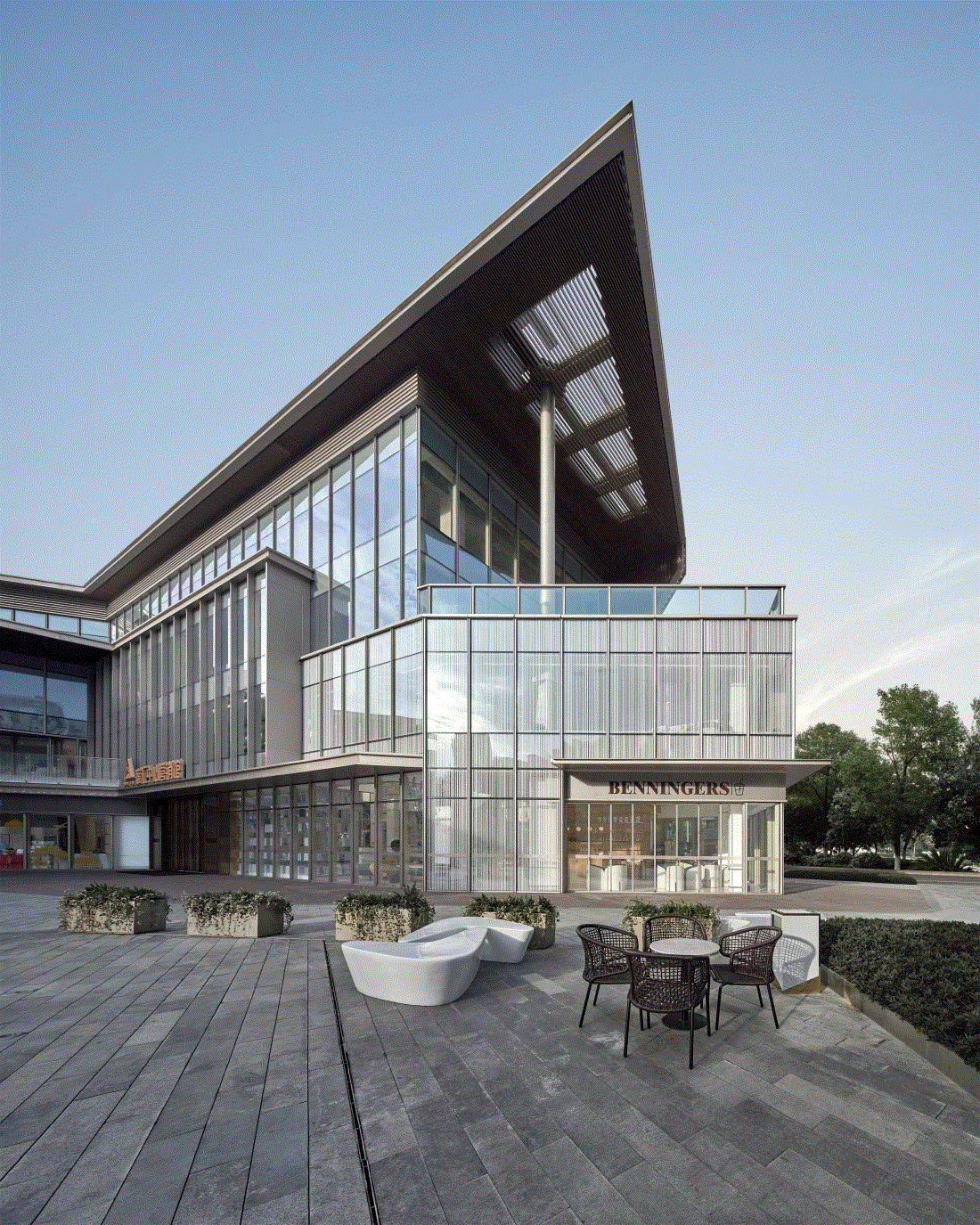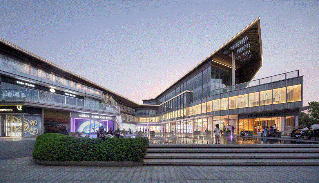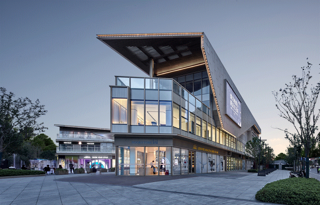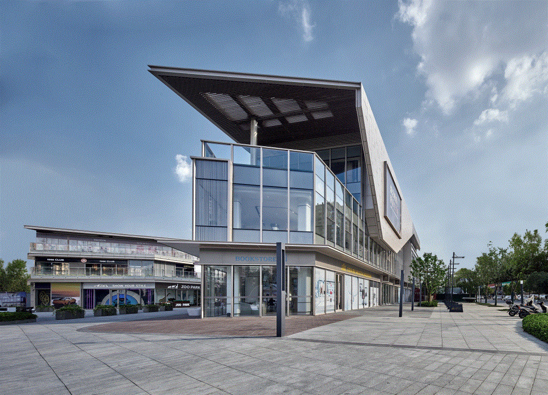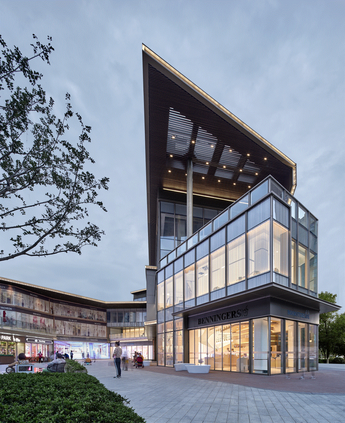 夸张的挑檐延伸城市天际线,采用色彩丰富的铝合金材质与玻璃幕墙,营造商业氛围感及丰富度,强化商业街区的入口形象。