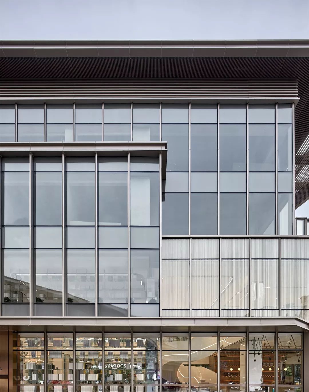 在外立面材质的设计上,设计师采用简洁模数化玻璃幕墙体系结合香槟金色的金属铝板,与周边住区的素雅形成鲜明的对比,增强商业中心的视觉感受。深度研究彩釉玻璃样式尺度 ,通过玻璃的反射与折射,映衬和谐开放街区,又与周边环境遥相呼应。