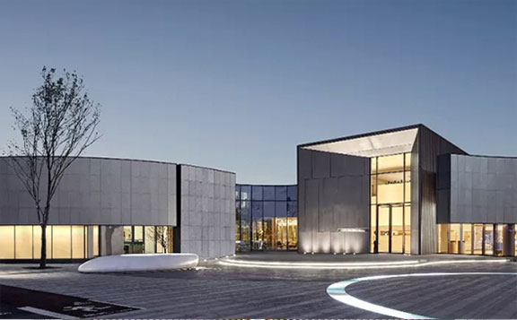 水院中的滨水鎏金,以顶部30cm斜切香槟金铝板面加精致金属肋条绘就,整体大面落地窗,形成一座座云瀑之幕。