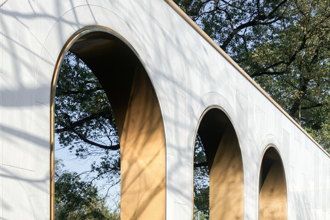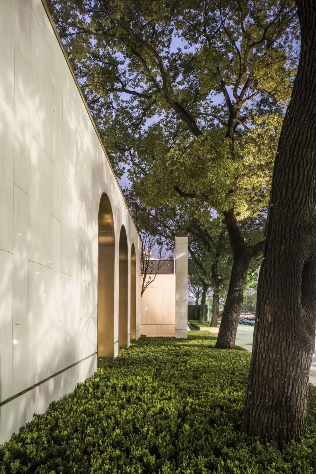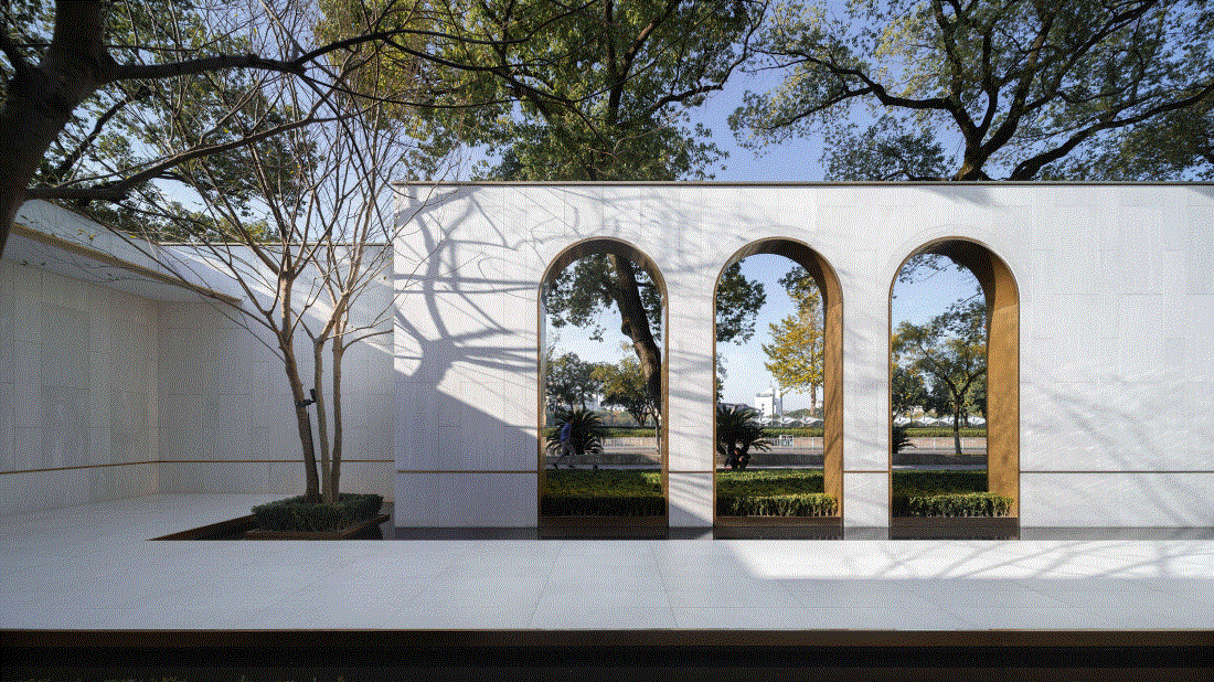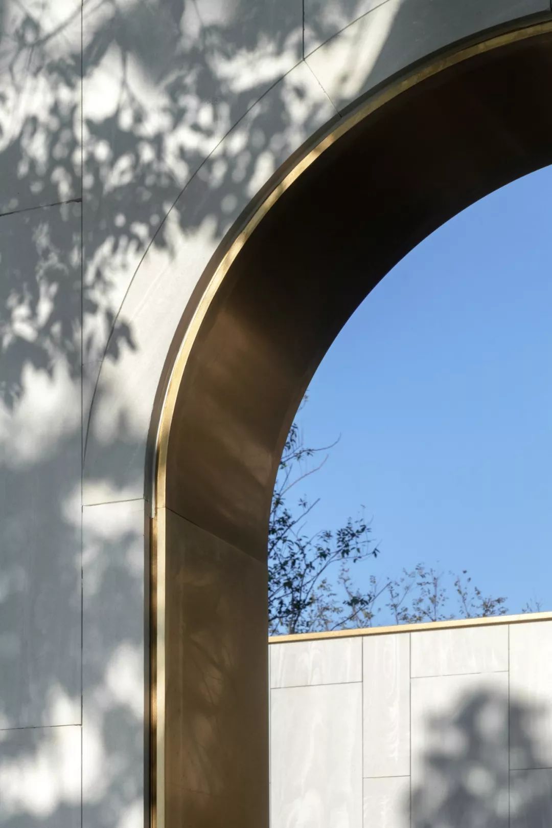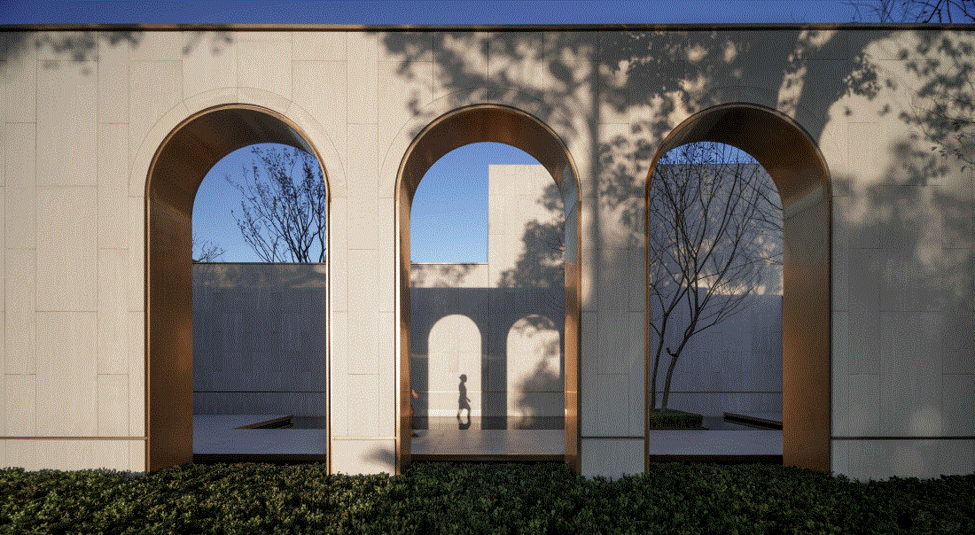 水波和光线,纯净的墙体,赋有象征意义的圆形拱券,树影中的金色线条……以现代主义建筑表达方式使不同材质之间链接,作为对场地的自然人文环境的关照,延伸场所中抽象的时间感,回望城市的荣光。