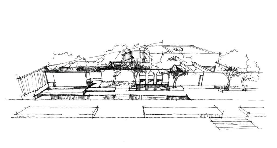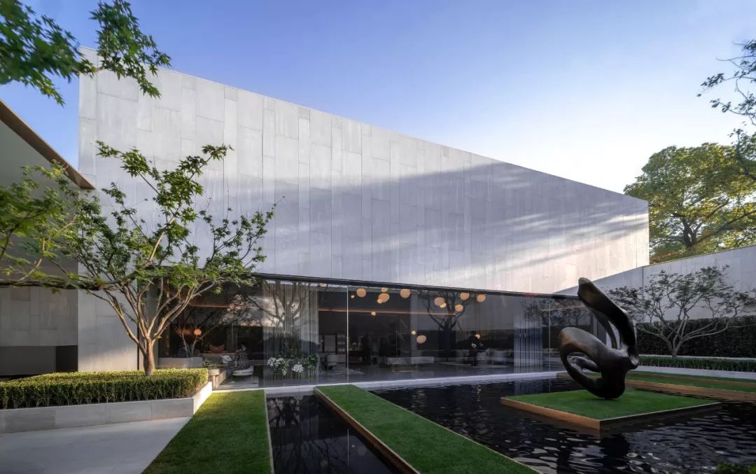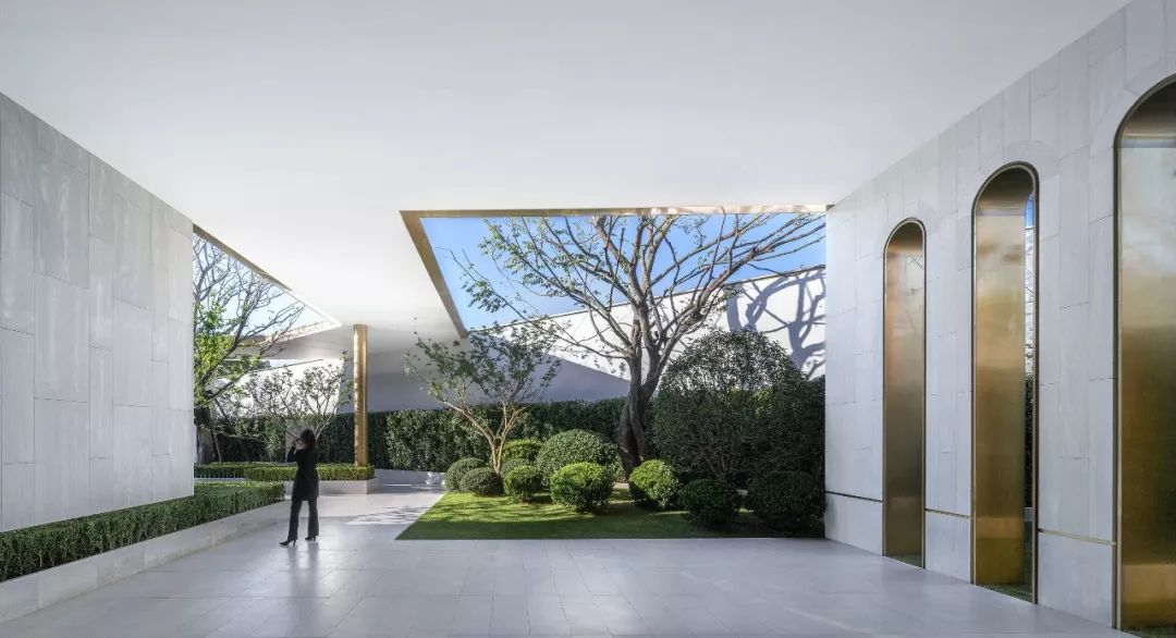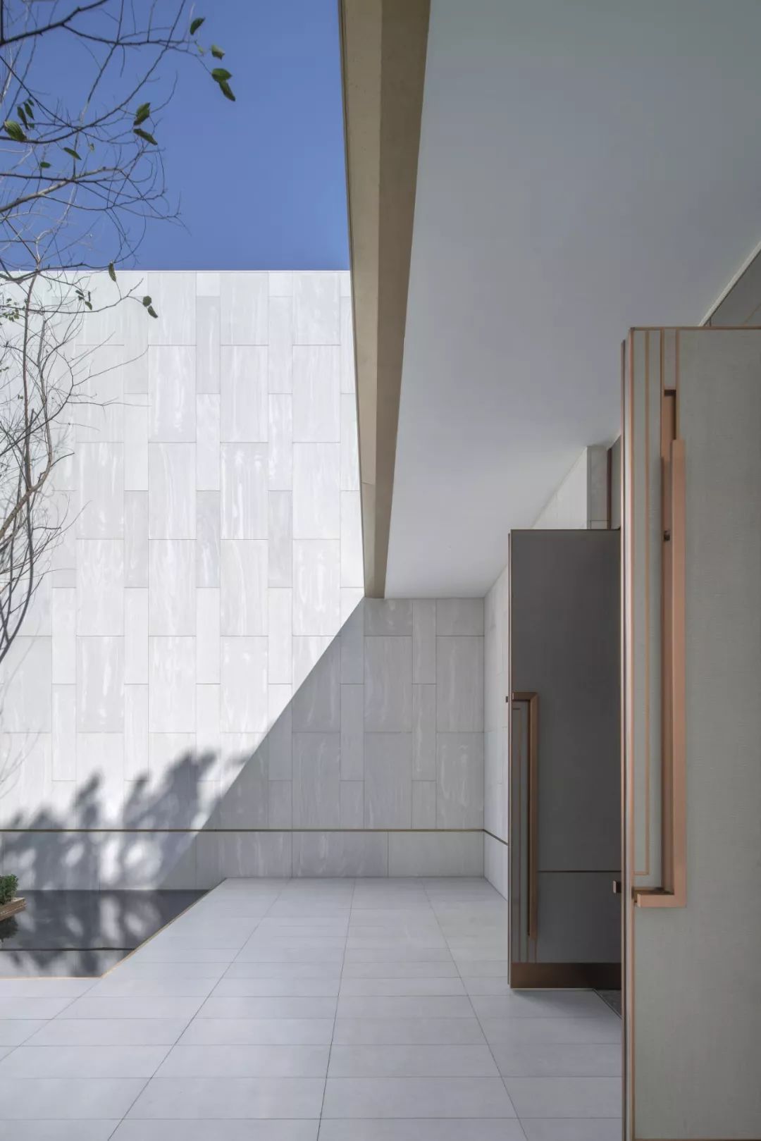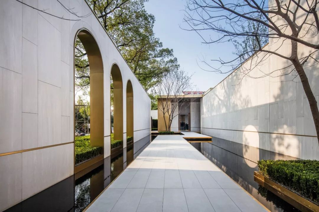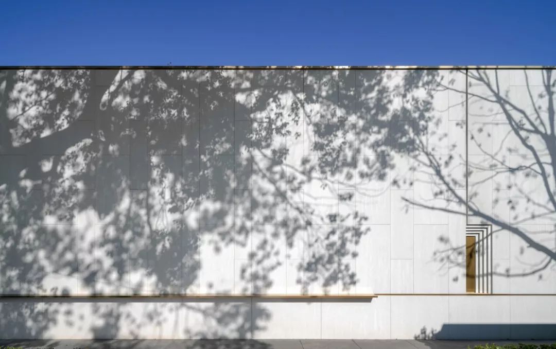 水波和光线,纯净的墙体,赋有象征意义的圆形拱券,树影中的金色线条……以现代主义建筑表达方式使不同材质之间链接,作为对场地的自然人文环境的关照,延伸场所中抽象的时间感,回望城市的荣光。