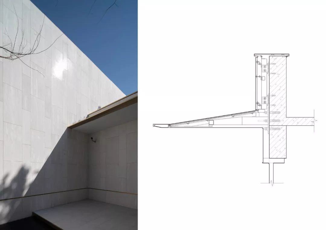 各屋顶檐口下部均设置有滴水线,防止吊顶挂污。干挂预制混凝土板采用密缝形式,使得景墙效果整齐划一。