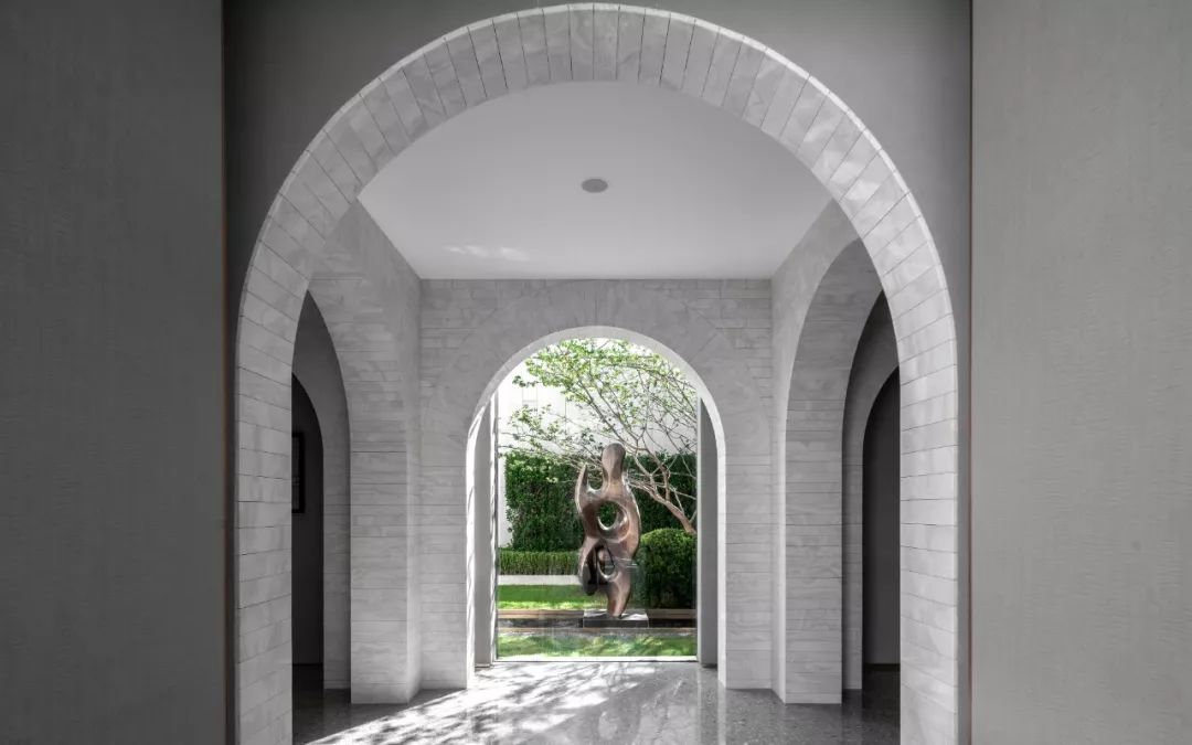 受到老外滩与三江口的历史人文的浸润,时隔百年基地周边仍然保留有法领馆与教堂等洋房,其中最具有象征性的圆拱,已然成为文化符号留存至今。我们将蕴含历史印记的传统符号抽象化,运用现代建筑的表达方式,献礼这座城市的精英智士,诠释精致典雅的生活方式。