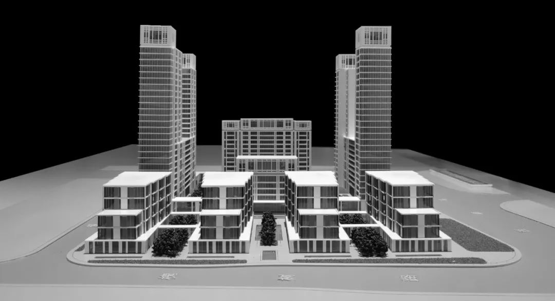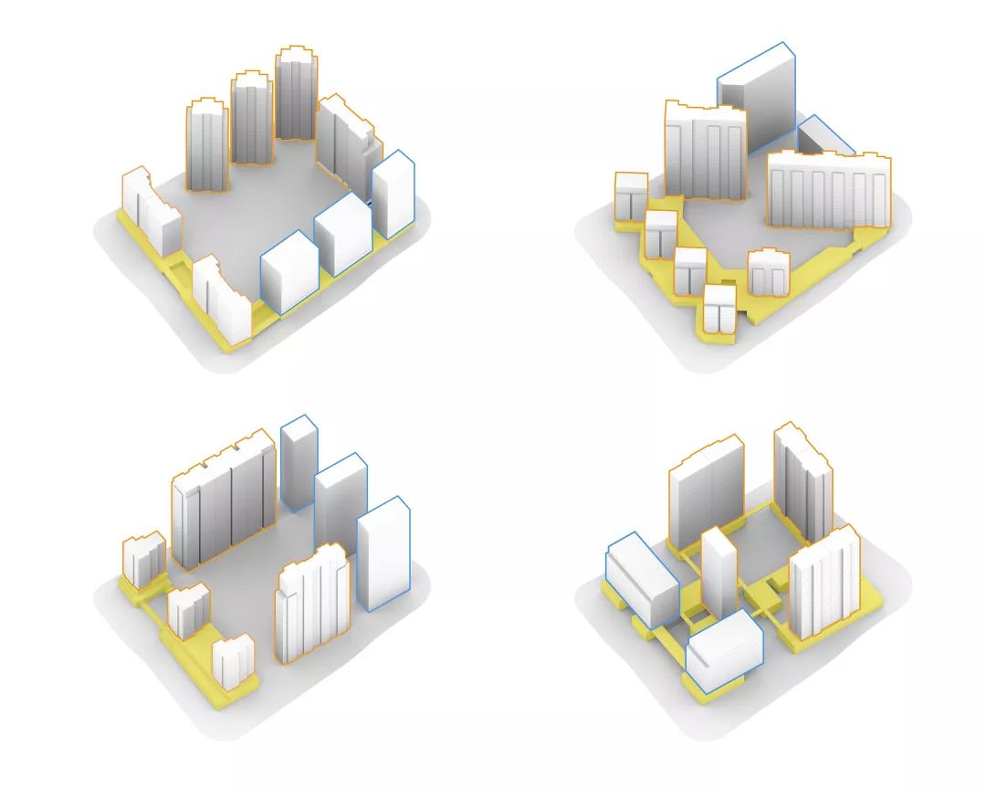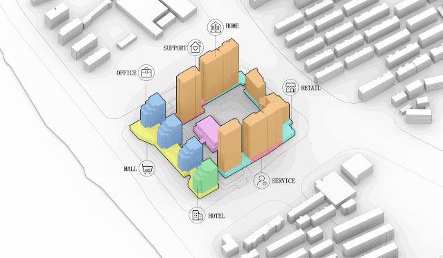 在90m限高以及基地内9m公共步道限宽的制约下,经过用地条件、日照计算边界条件等分析过后,总体设计最终采取对称规划布局,涵盖居住、办公、商业、酒店、街区配套等多元业态,打造具有仪式感的高品质城市空间氛围。