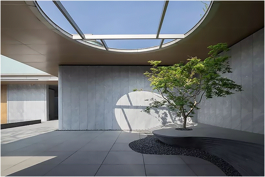 ◎洽谈区引入了天井和中庭的景观设置,通过内庭院的采用,使其具备了侧面采光的条件,延伸空间景深同时也增加了内部与自然的亲近感。