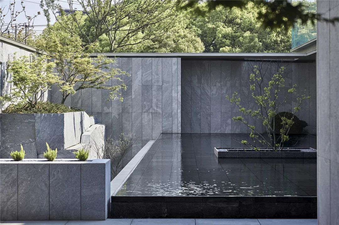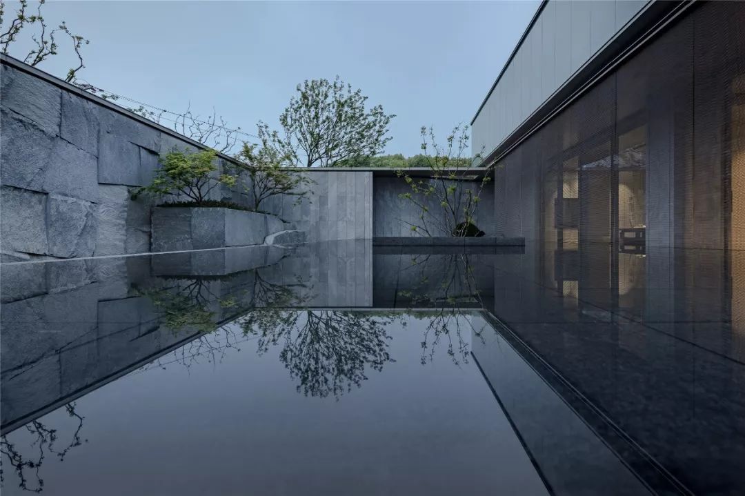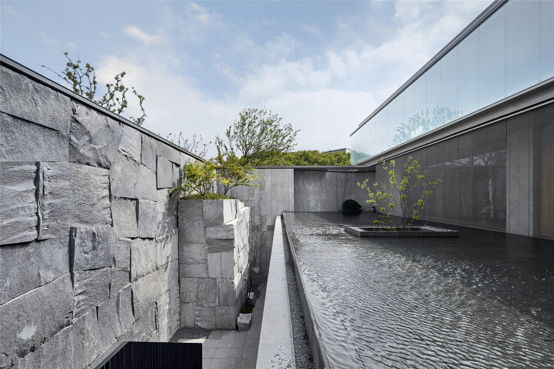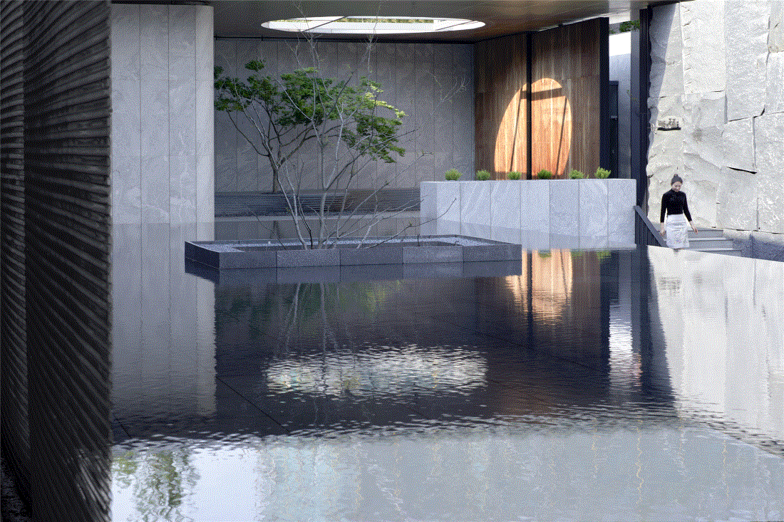 为使示范区建筑朝向城市的视觉效益最大化,弥补因占地小可能带来的体量感不足,致逸设计团队对基地一侧的停车场立面进行改造借用,使其在视觉上错位成为案内建筑主体的一部分,并利用石材竖向肌理、中央水景的镜面反射从纵向扩展建筑的视觉形象。