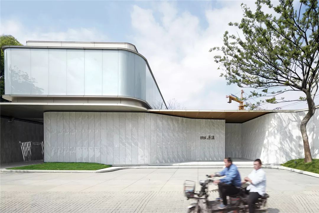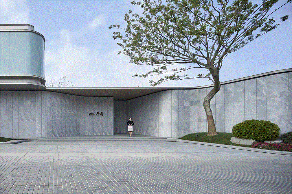 “合于天造,厌于人意”,从宋代汝窑展现的美学中获得启发,示范区入口处建筑在材质选择上删繁就简,采用新西兰麻灰石岩作为建筑立面主体材质,大面积夹胶玻璃则取其趋近汝窑净润青雅的色彩意象;建筑立面的曲面处理,是在直线中求得曲线,这与宋代美学的极致抽象线条的提炼方法同出一辙。与此同时,通过材质与线条将建筑、景观、室内三者融合一体,以此模糊室内外空间的界限,促使空间感向更大的向度延伸。