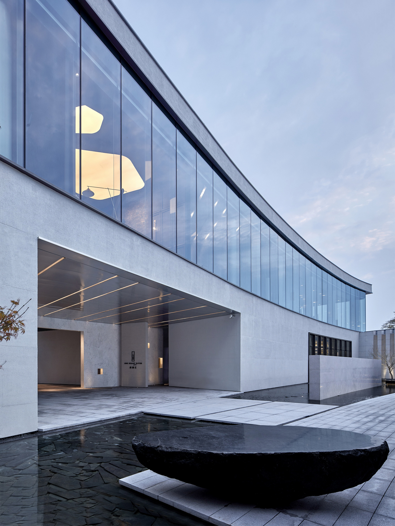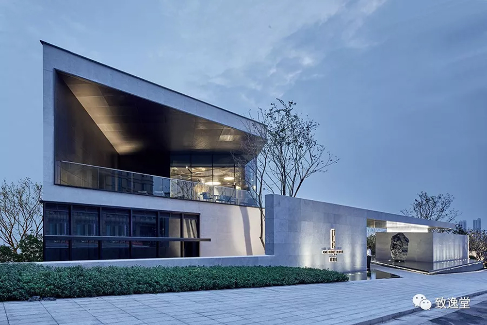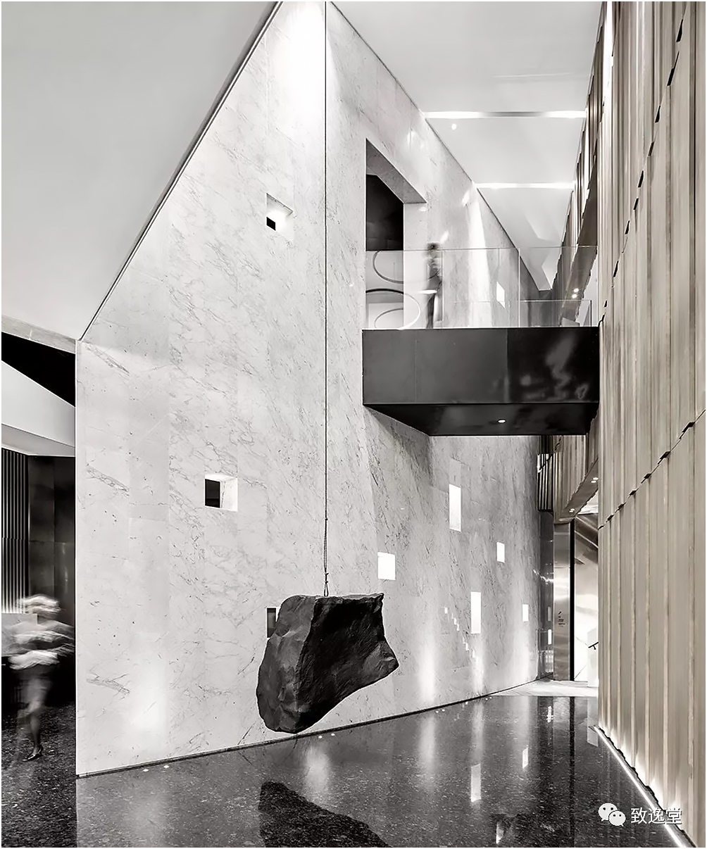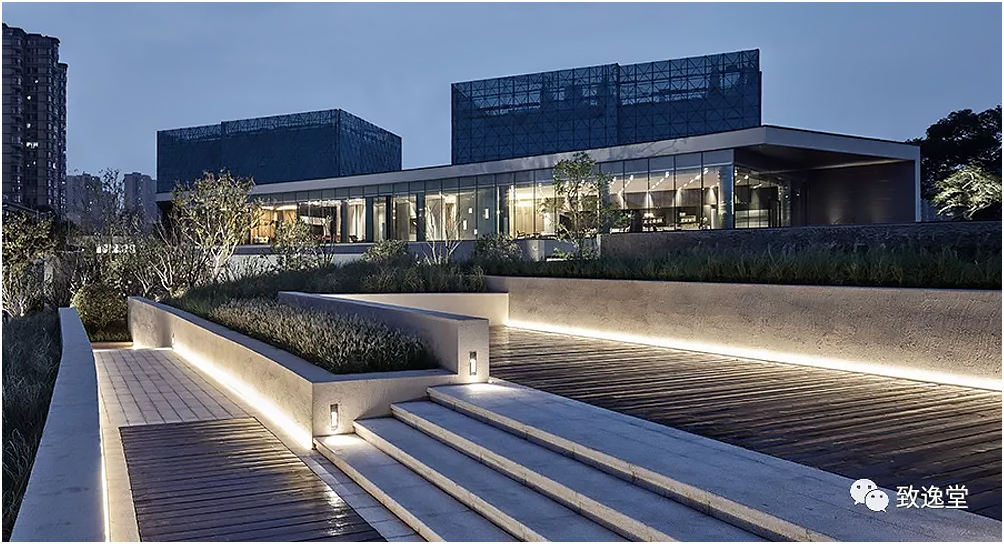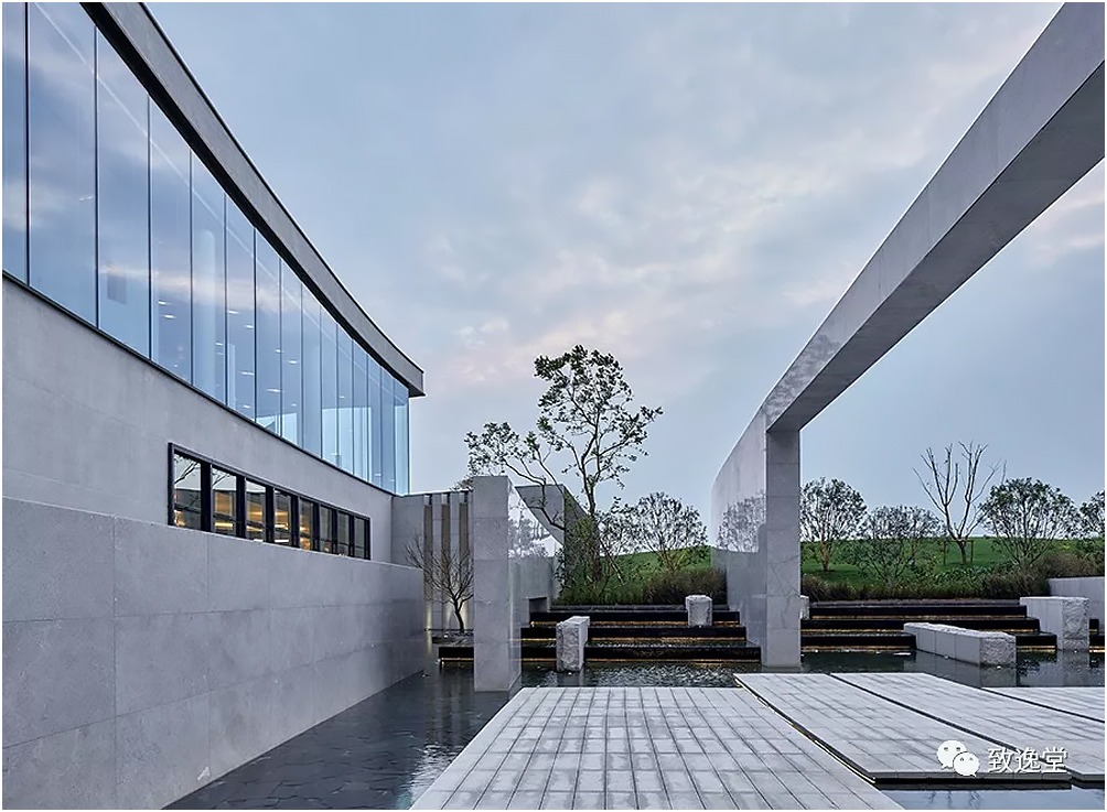 俯瞰印湘江,江水边的她高低错落,形成了流畅的天际线。入口处,三角形的区块由侧边切入,回折向内的过程也是由低至高的衍变。抬眼处是黑色台阶与碎散的白色体块,黑色以沉稳,白色以跳跃,黑白的动静碰撞经过水的调和以及绿的补充,和谐的向外延伸,而侧边的矮墙也保持了这种关联性。