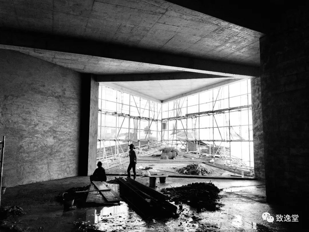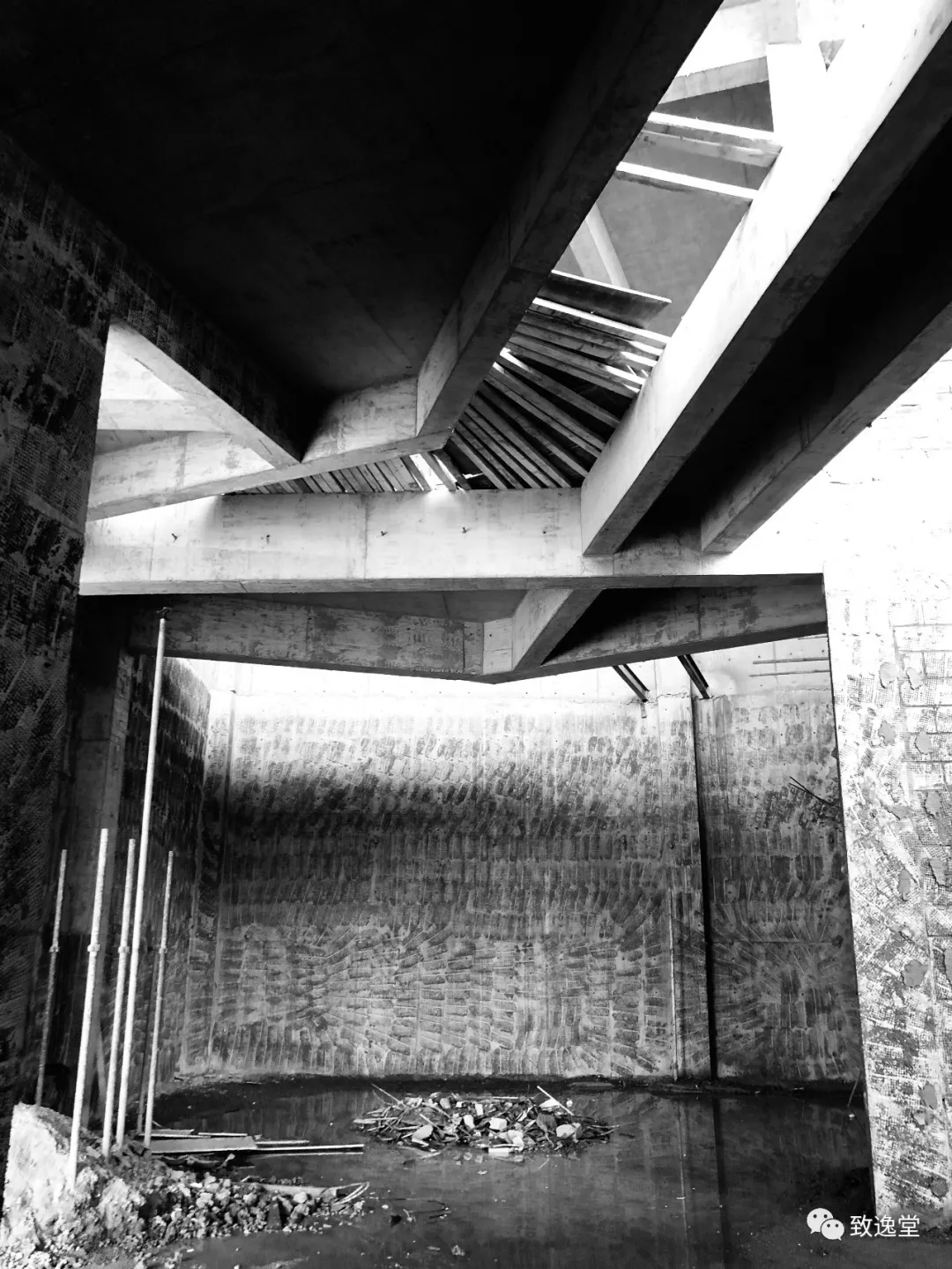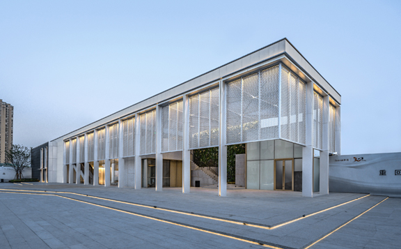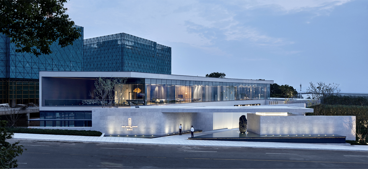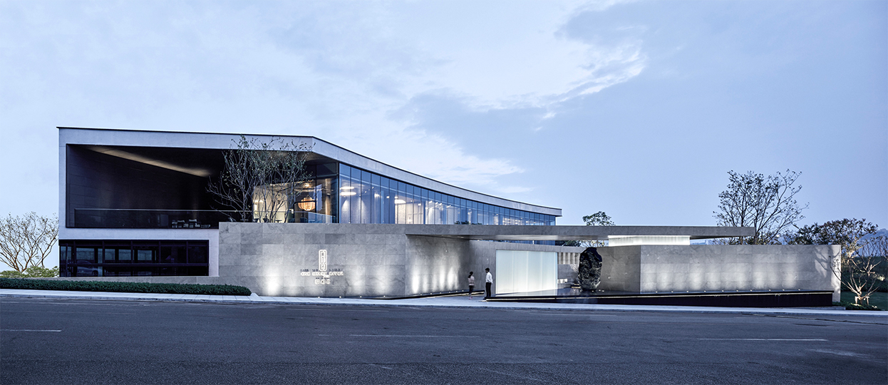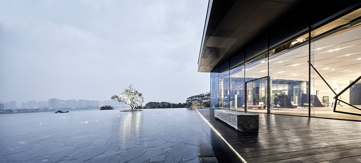 俯瞰印湘江,江水边的她高低错落,形成了流畅的天际线。入口处,三角形的区块由侧边切入,回折向内的过程也是由低至高的衍变。抬眼处是黑色台阶与碎散的白色体块,黑色以沉稳,白色以跳跃,黑白的动静碰撞经过水的调和以及绿的补充,和谐的向外延伸,而侧边的矮墙也保持了这种关联性。