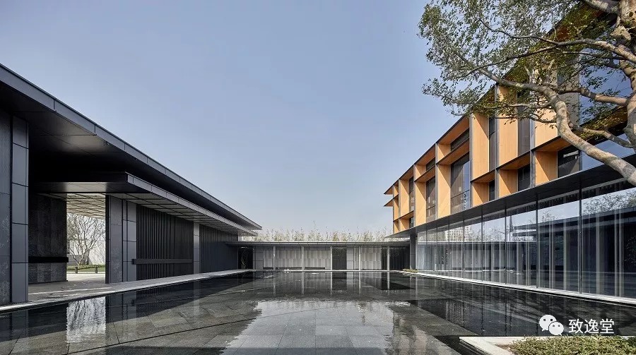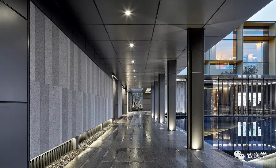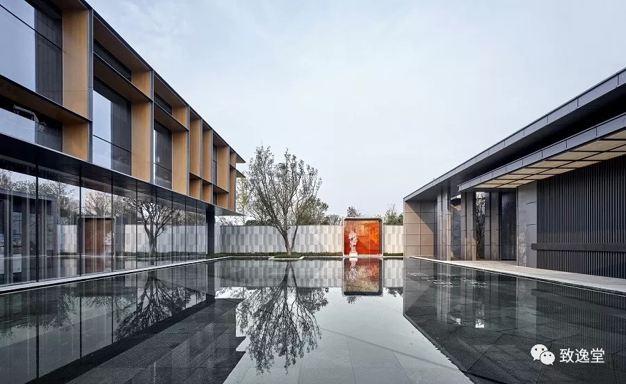 项目中将前院景观延续至小区中央景观轴线,打造四重院落,形成城市界面-镜面湖水-枯山水-小区景观轴线。