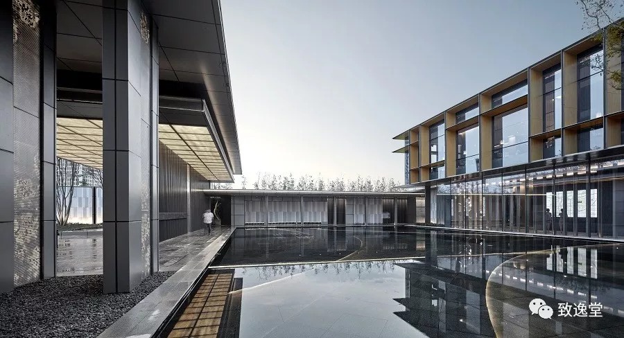 进入即见大片的镜面水,方正坦荡,扩大空间感的同时丰富了行走的感官体验,结合草坡、绿地和风雨连廊的设置,