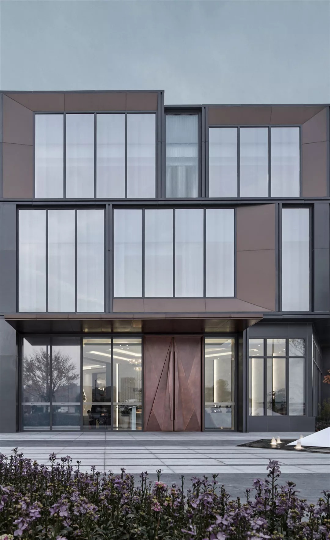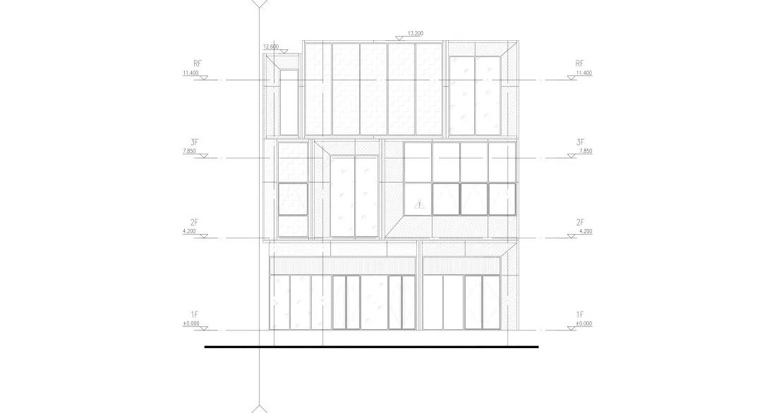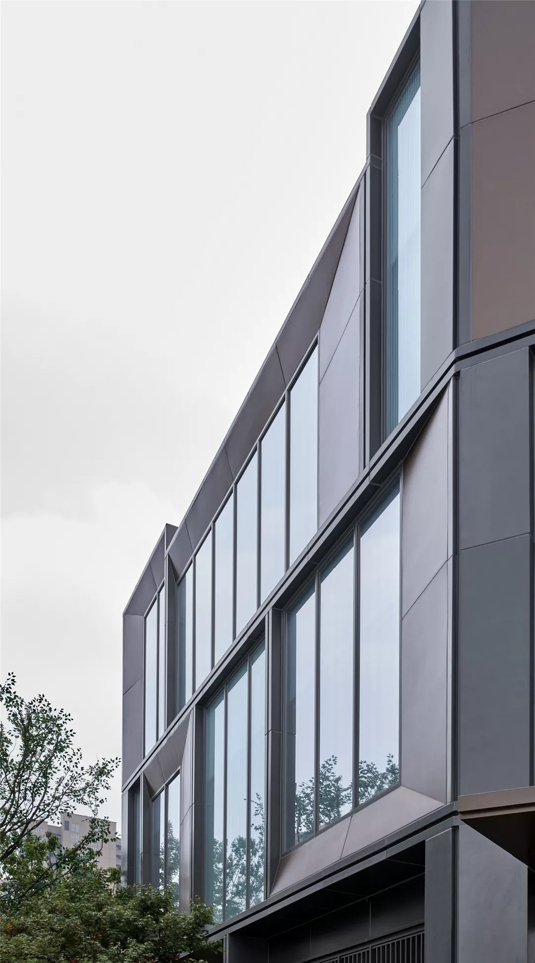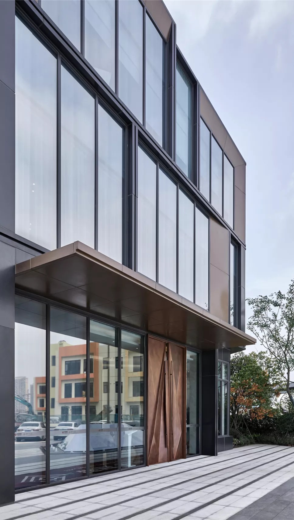 立面以铝板和玻璃这两种材料为主。细节上,铝板采用两种状态,灰色铝板和铜色铝板,灰色用于立面铝板框和部分铝板面,铜色用于雨棚和凹凸铝板面;玻璃亦使用了两种形态,高反玻璃和印花玻璃,力图使整个建筑现代而不花哨,素雅而不刻板。