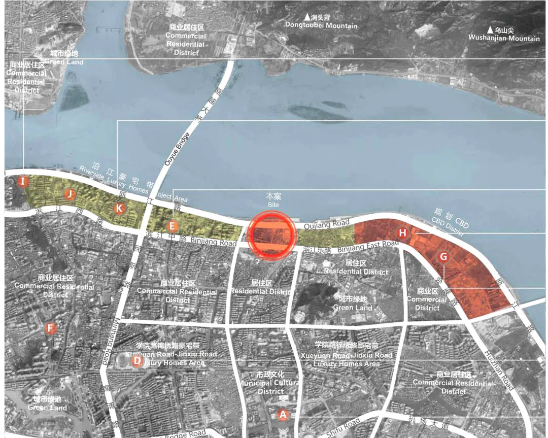 如同哈德逊河之于纽约,泰晤士河之于伦敦,塞纳河之于巴黎,在涉及城市尺度的环境规模、时间与复杂性的情况时,滨水天际线对于营造国际都市景观的可读性,通常具有特殊的作用。作为温州新兴商务区,项目基地虽为城市沿江界面的重要构成,但现状中平均宽高比接近1,缺乏可圈可点的景观高潮节点。