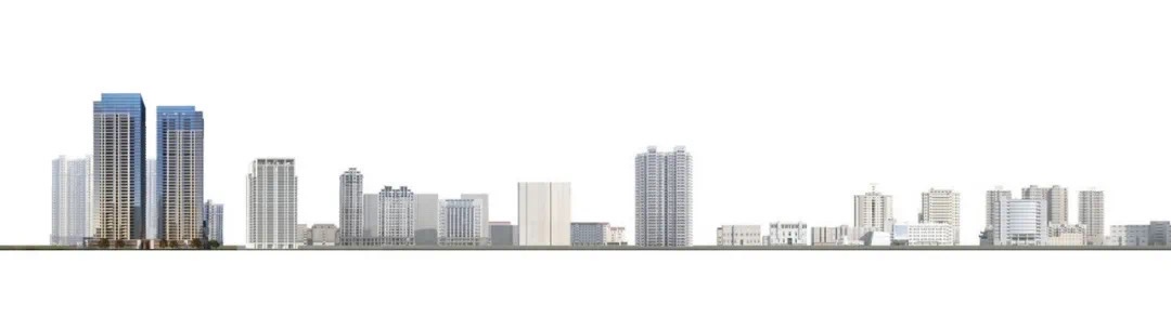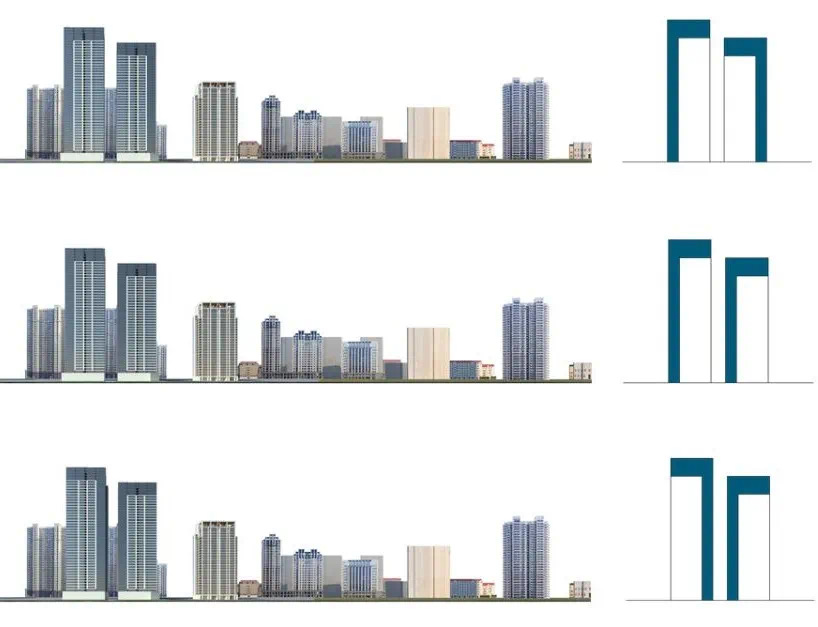 从城市角度出发,我们发现过多的塔楼体量对南侧安置房及西侧道路均形成压迫效应。因此设计将地块西侧高层体量进行拆解,分成两个较低矮体量,避免对安置房形成压迫,改善对现存界面的城市关系。