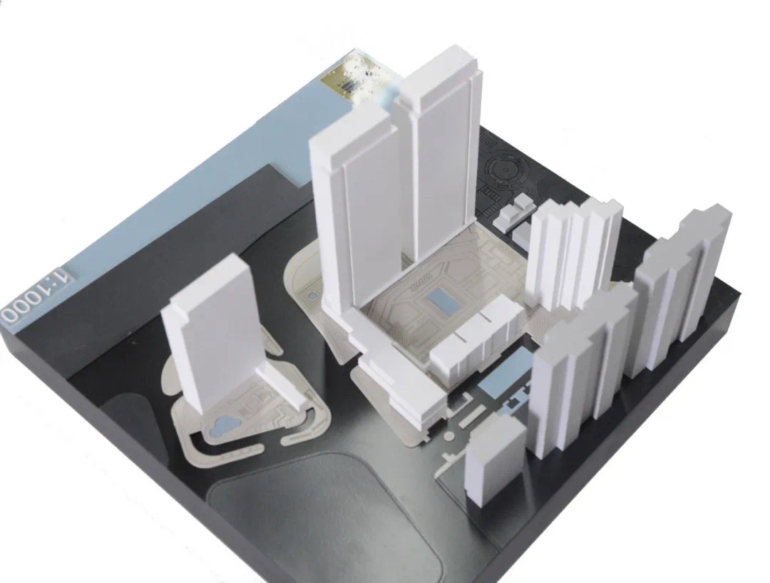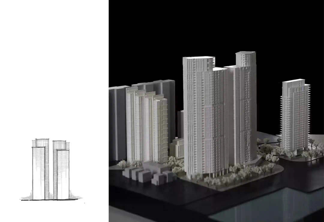 为此设计团队首先着眼于完整有序的城市风景带,以塔楼高低前后错落形成局部的建筑节点、统领收头,打造具有标志性的超高层建筑形象与城市天际线。