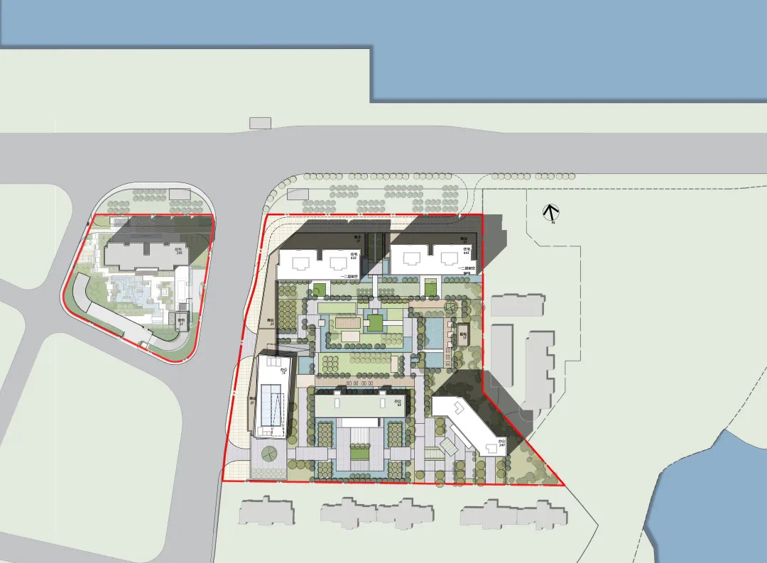 依据景观资源的价值高低将基地划为三块区域,形成东北高,西南低的规划形态,以多元业态包围居住区。临一线江景,住宅区被置于地块北侧;办公在东侧,呈N型的建筑体量顺地形而为,拓展面向公园和江景的视野范围;商业则沿主要街道布置,联动城市公共空间,激活场所周边的人流,发挥其最大的价值。