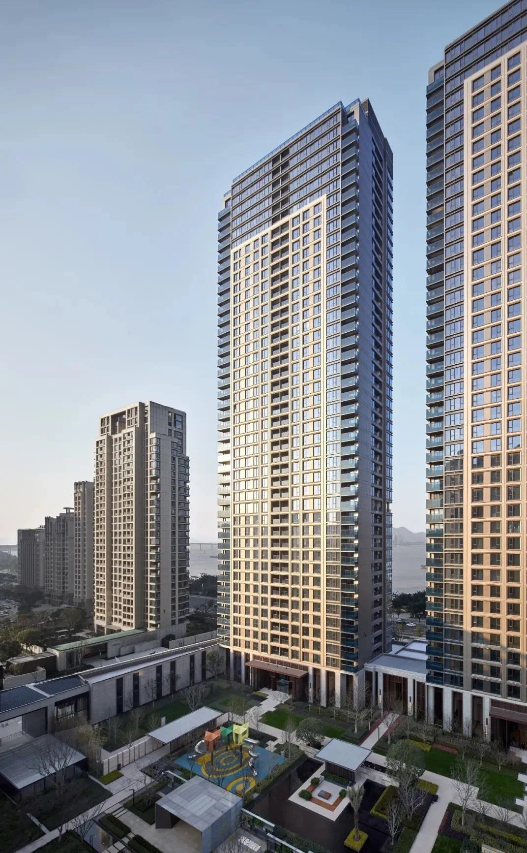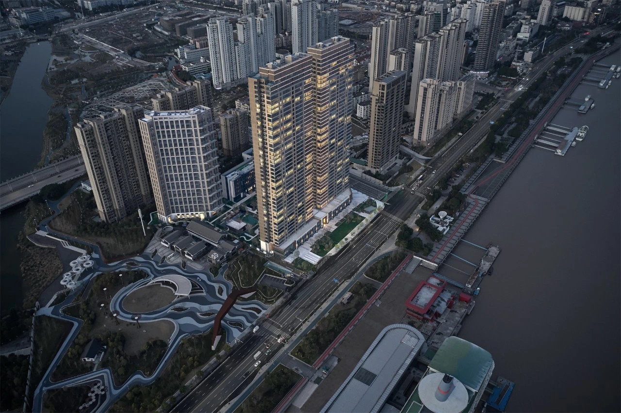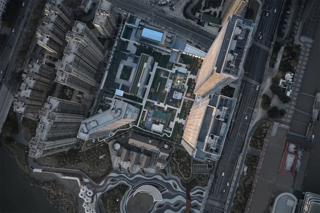 在高密度城市集群土地上,设计团队重视建筑的体验感,重构城市空间的开合序列,满足人对多元空间的需求:向外,能最大化自然景观与公共资源,缝合城市街道、广场、水岸以及周边公园;向内,则能形成递进的围合之势,营造私密宁静的归家感。