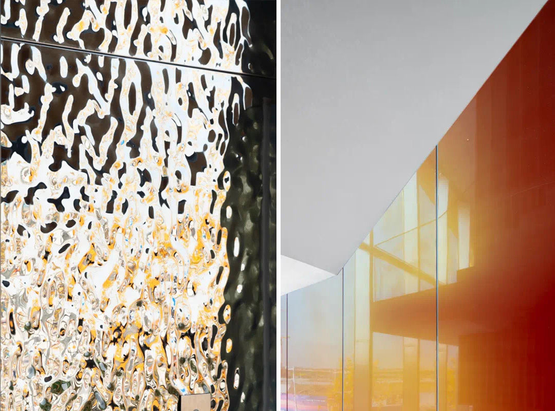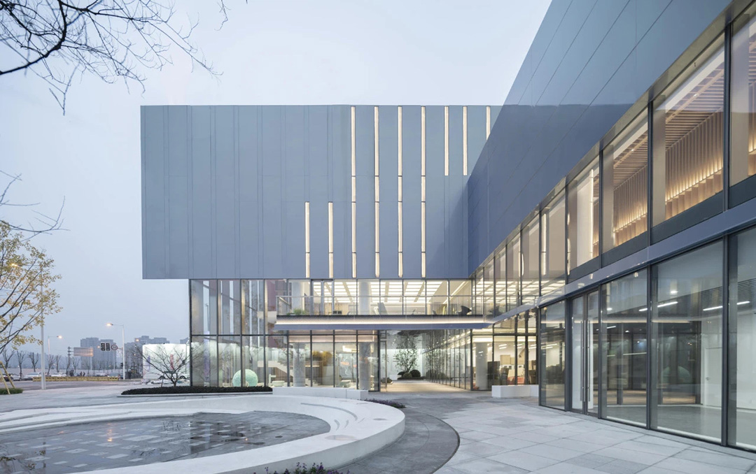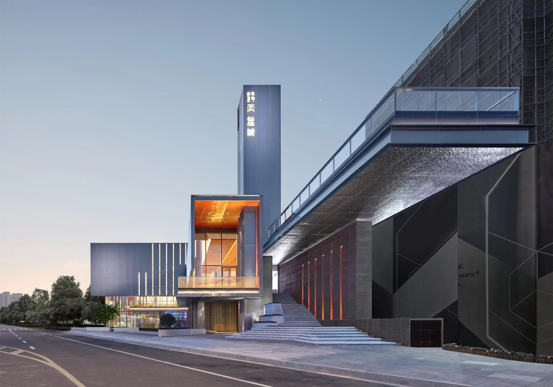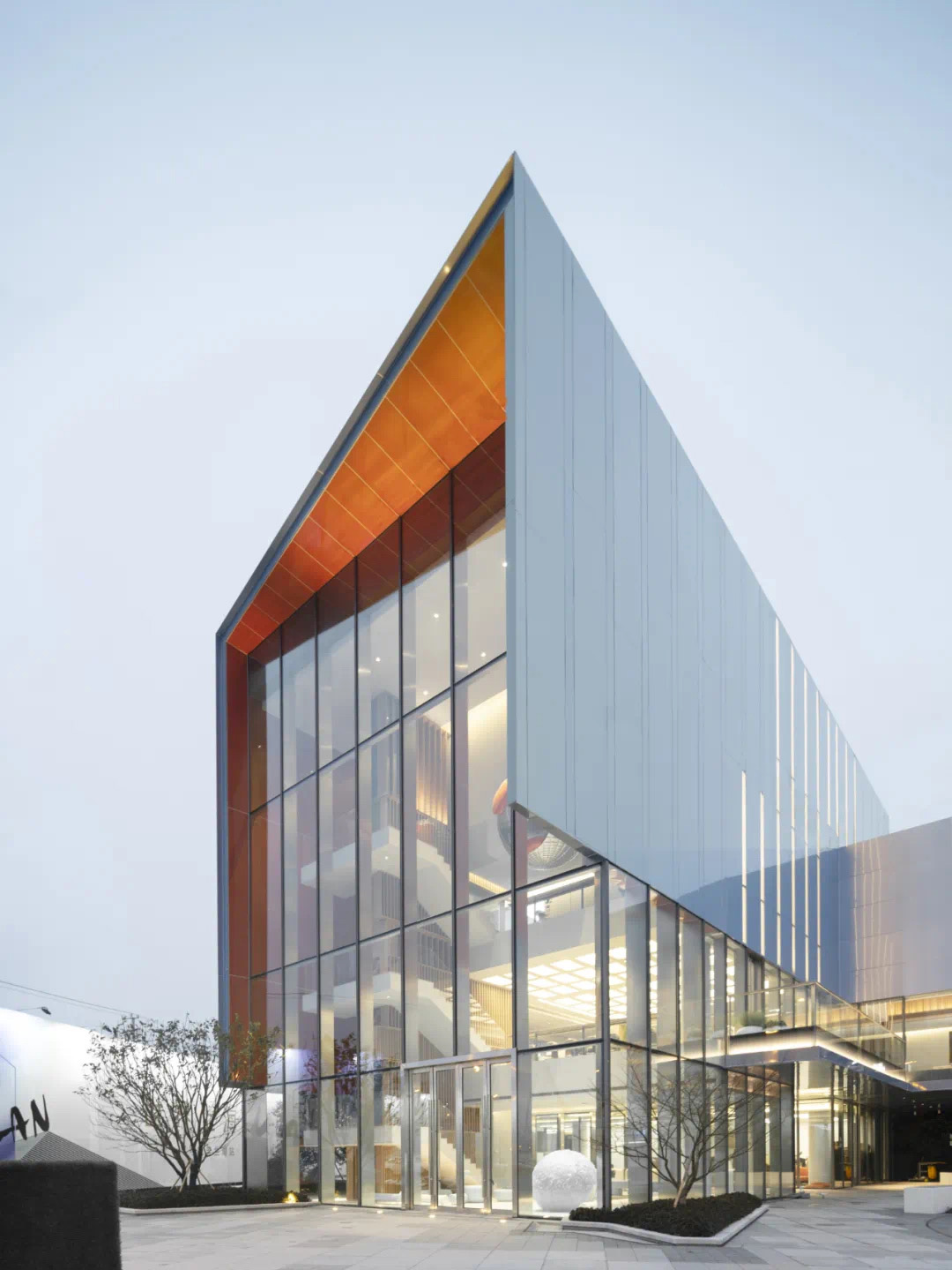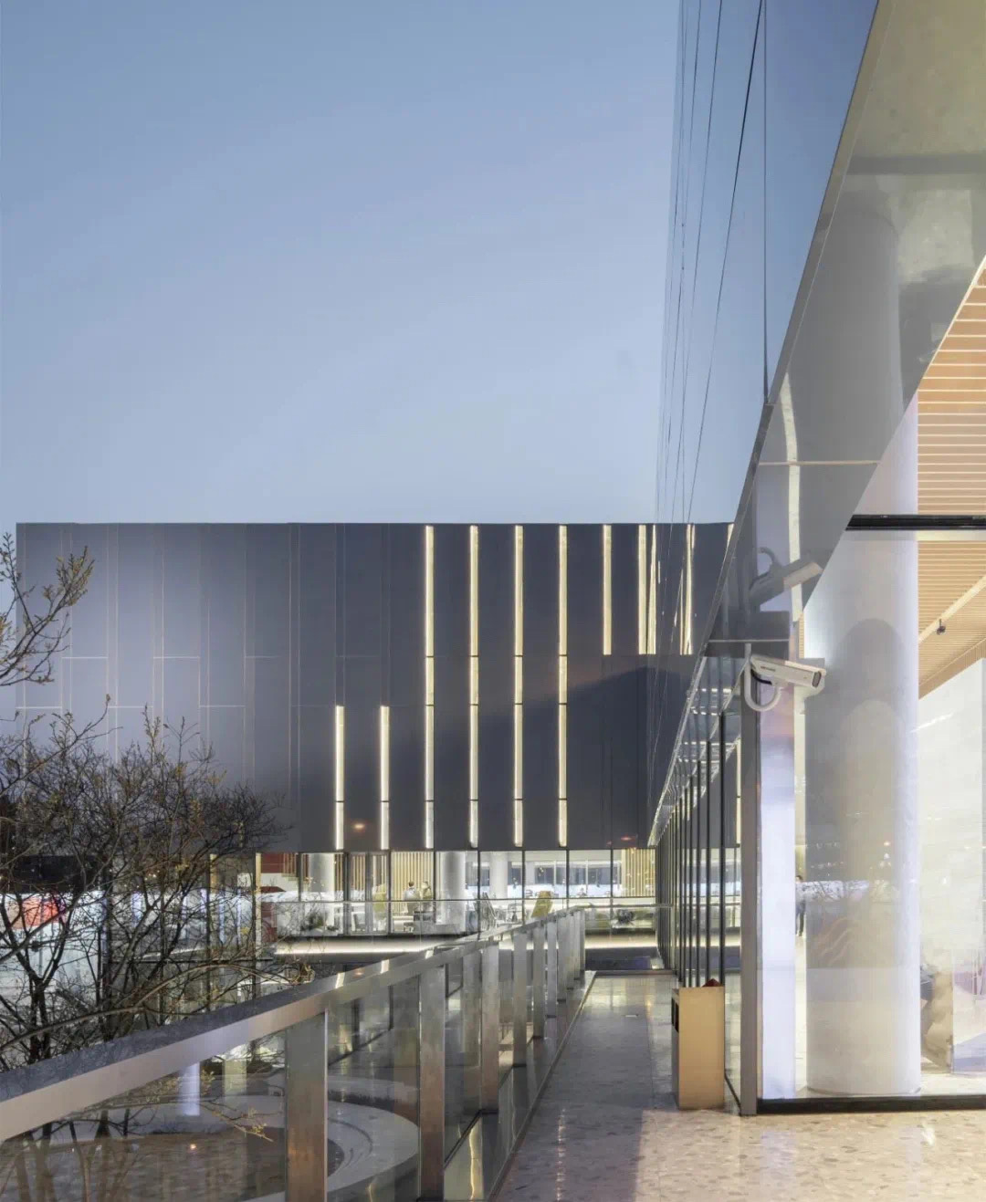 玻璃与金属铝板之间的交织也强化了建筑整体的明暗度,放大建筑的虚与实、内与外的反质关系。这正是对于城市场景的多元表达与回应,更折射出现实与超现实之间的体验感与戏剧性。