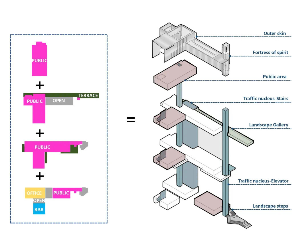 通过长方形的盒子体块与"碎片"元素之间的无序穿插,解构大结构空间、叠加重组小尺度构件,设计赋予各部分空间以功能,重新定义建筑的美感与场所的体验。