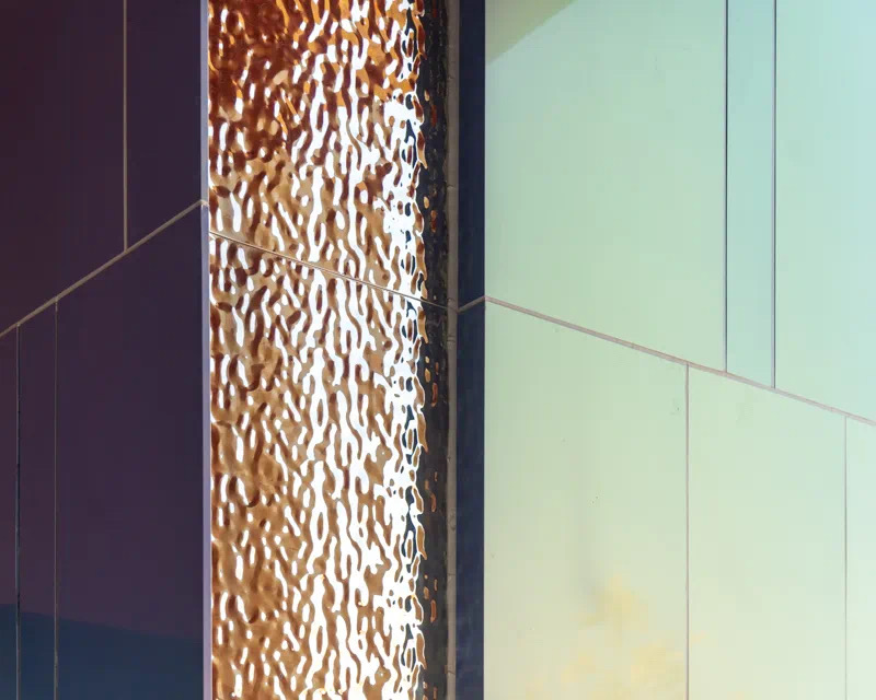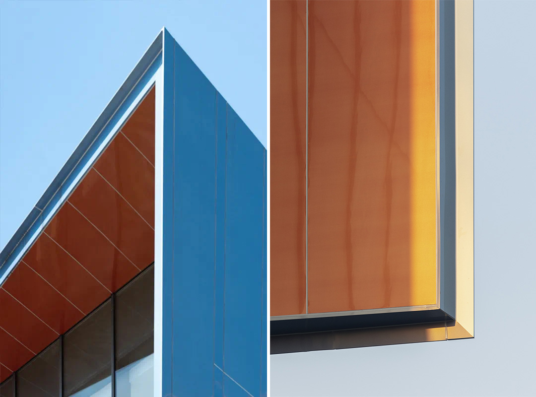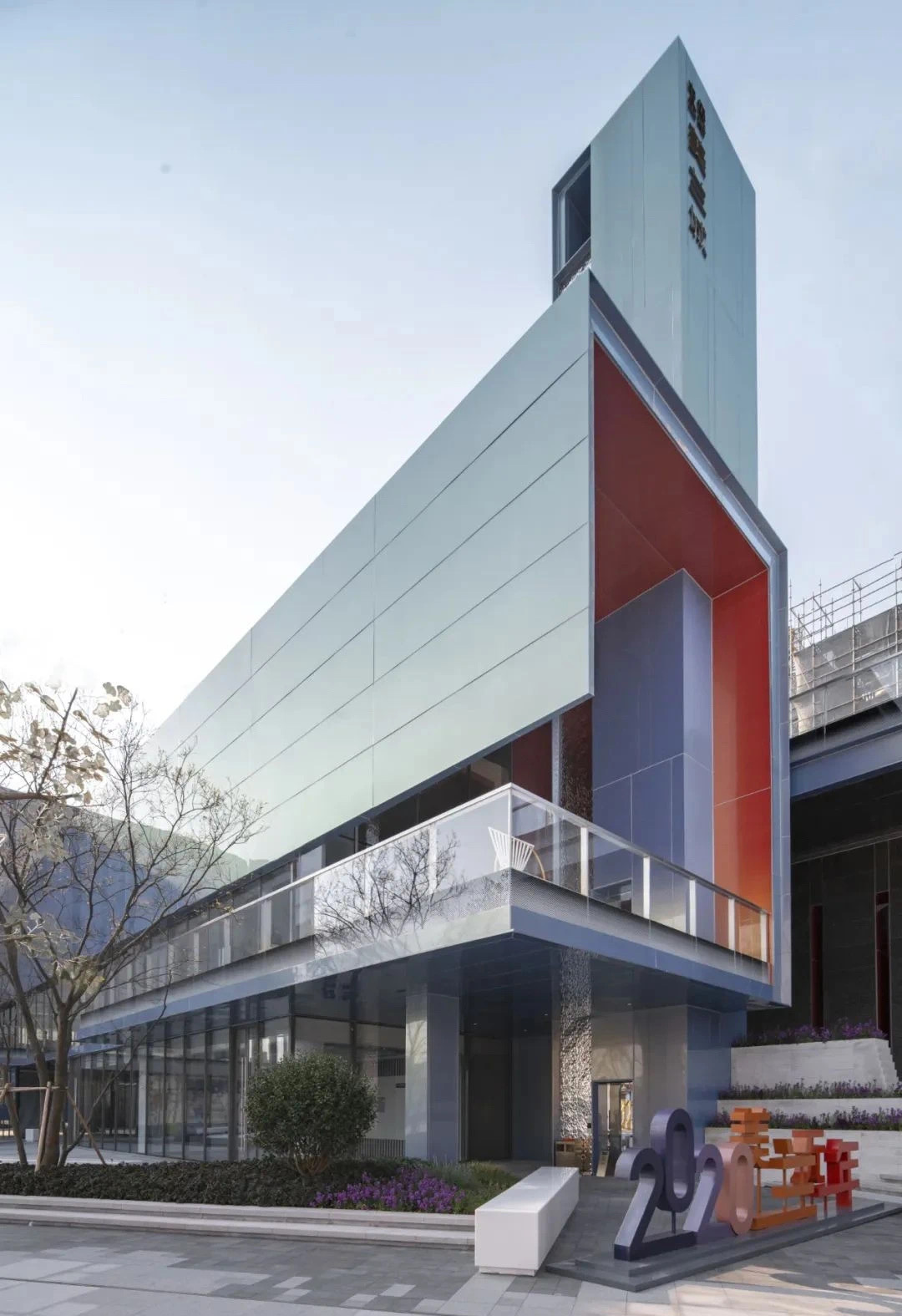 每片土地都应该有它独特的存在,拥有自己的色彩与印记。立面设计选用融合现代设计语汇的材质—蓝幻金的幻彩铝板,使整座艺术馆在不同的角度和光线下,呈现出不同的色彩与感受。