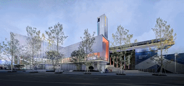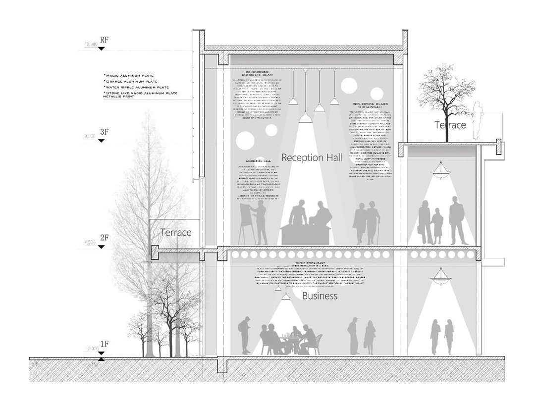 通过跨专业之间的协作沟通,我们重新组织体验空间的顺序:横向的玻璃盒子与大台阶构成了超长尺度的入口界面空间;穿过入口到二层平台,空间由一个两层通高的半透明盒子构成,作为展示与商业功能;围绕光塔,纵向的玻璃盒子以三层通高的姿态,在立体沿街面形成极富昭示性的标识感。