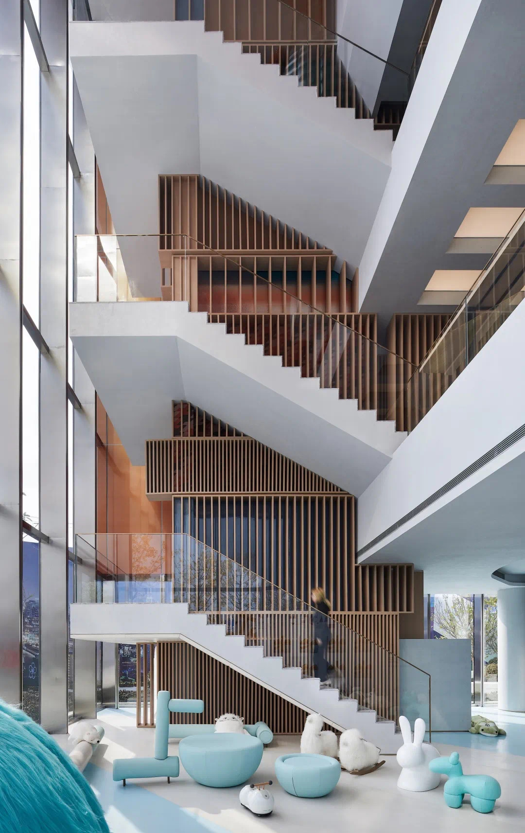 空间节奏及动线的预设,是主导体验的感性运动,在纵横交错的格局之下也能紧密联系每一个空间形态。这样的组织策略让戏剧冲突成为核心概念,其中16米挑空则将整个空间节奏演绎到最高潮,楼梯以挑空区和巨大幕墙为前提因素,尺度和等级也因此在视觉上的放大。