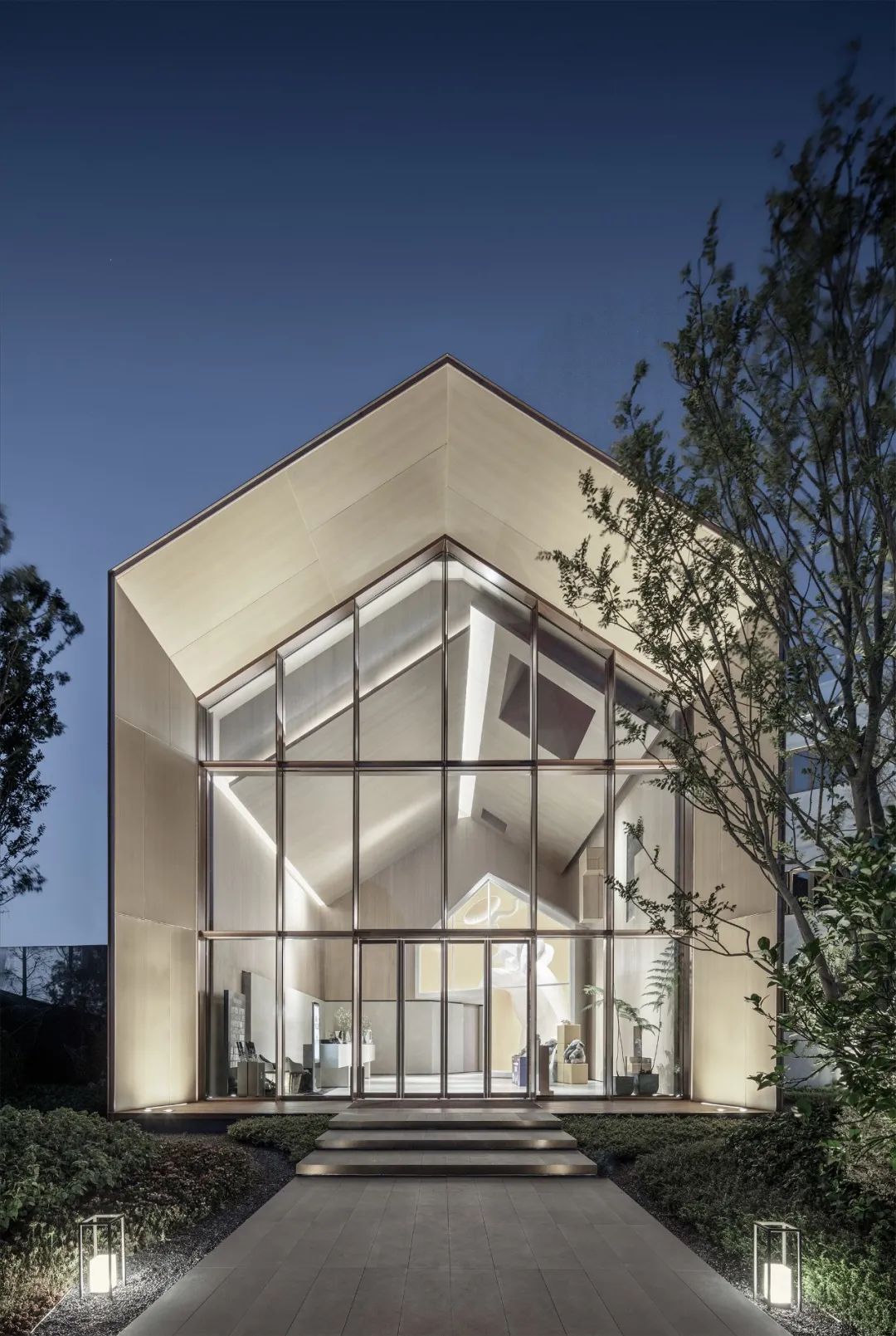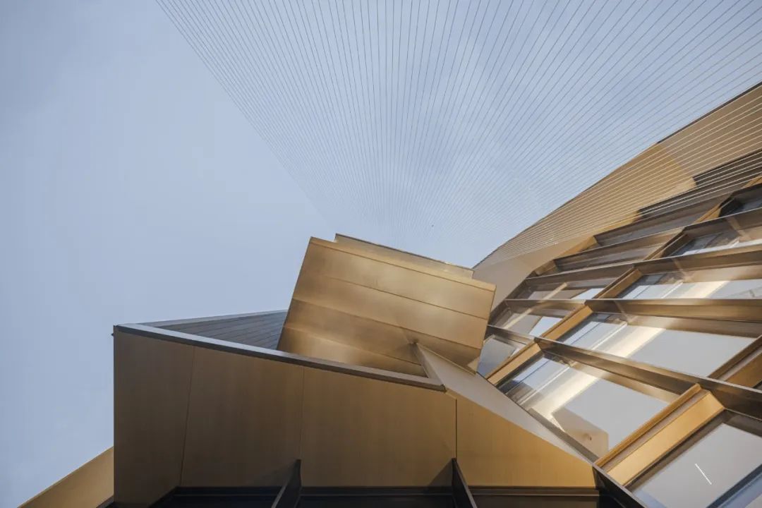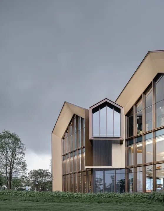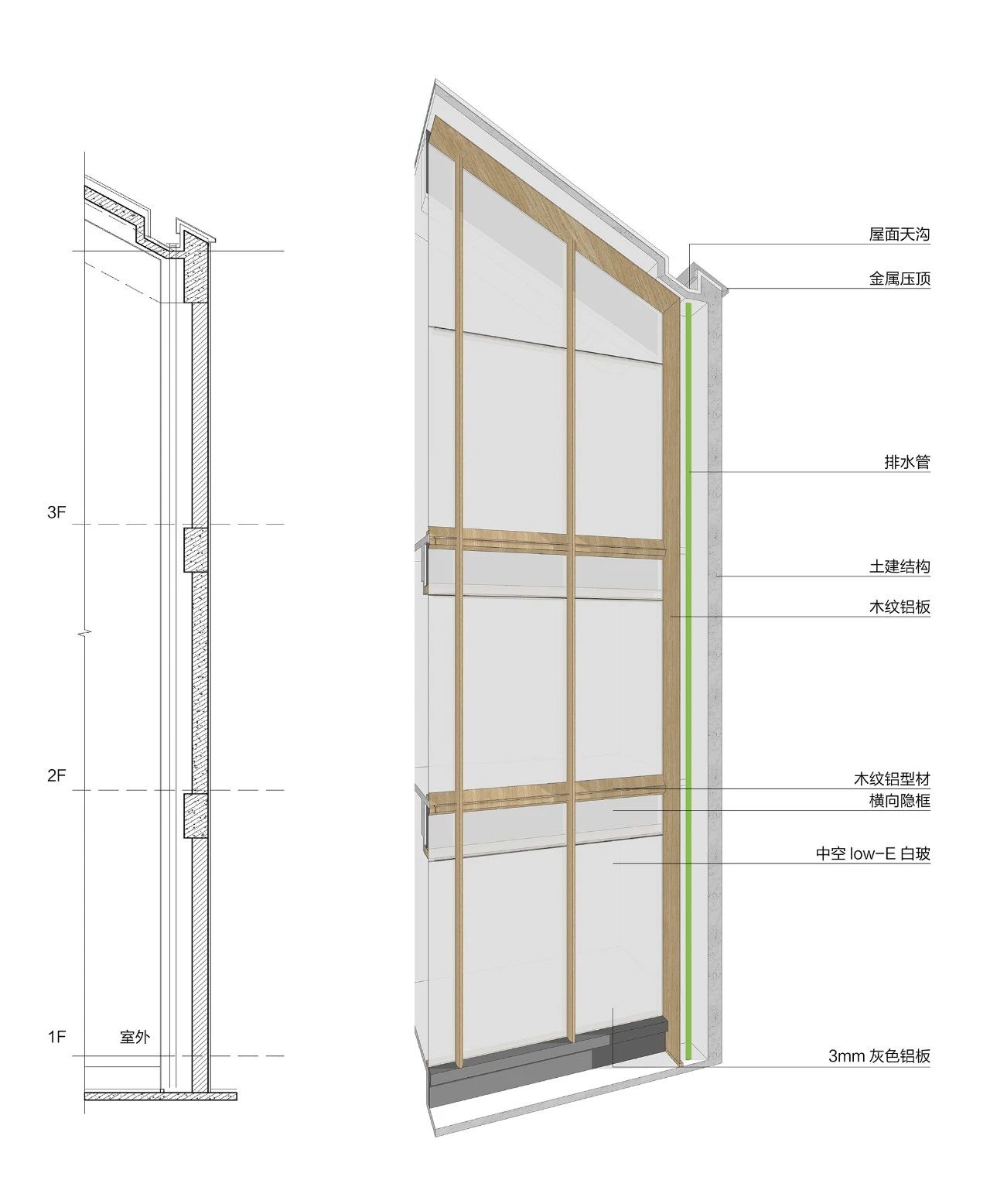 将材质落实到建筑实体的过程需要应用与实践。在不影响整体氛围感的前提下,正立面的铝板与幕墙的斜角连接处采用仿铜型材收边,节点之处富于现代工艺的质感。