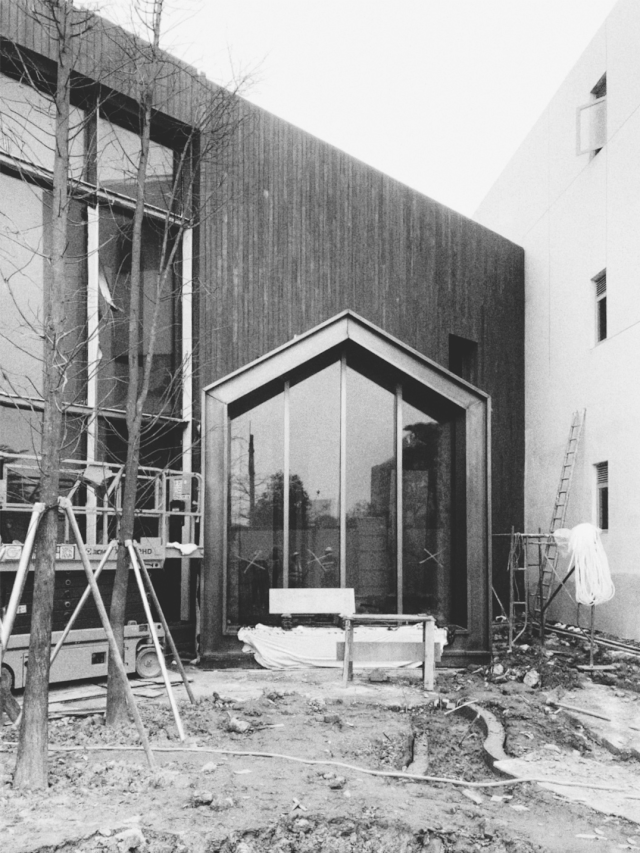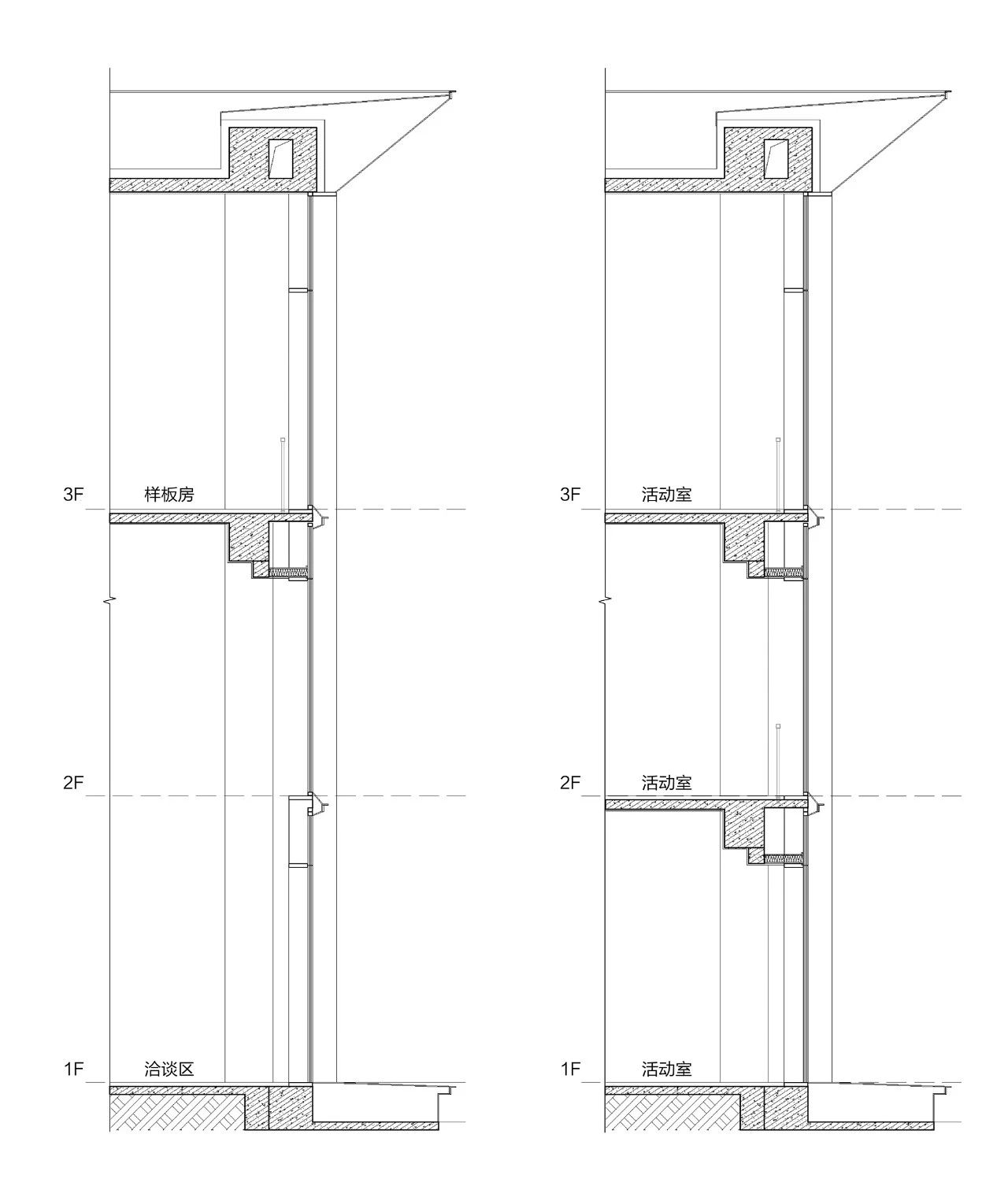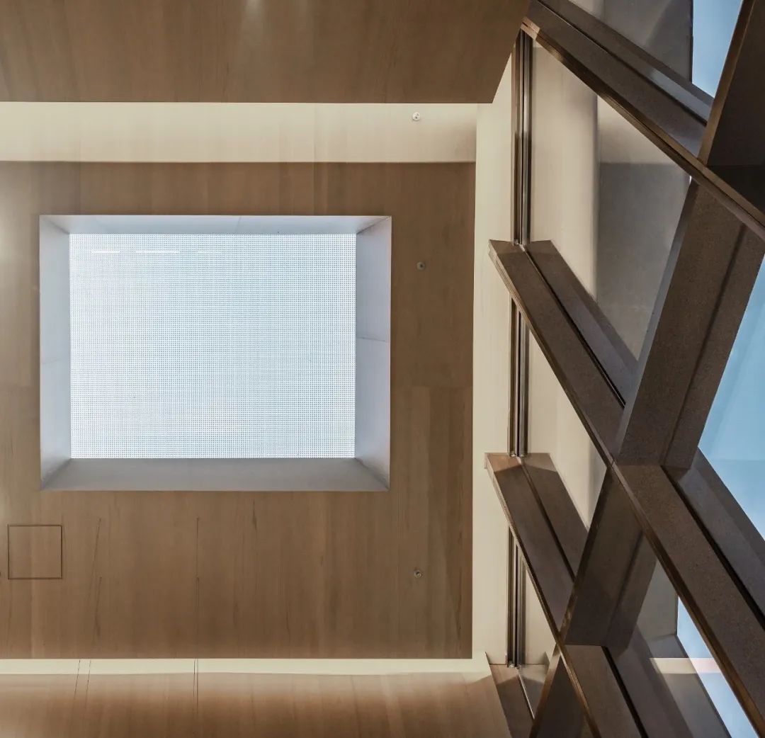 将材质落实到建筑实体的过程需要应用与实践。在不影响整体氛围感的前提下,正立面的铝板与幕墙的斜角连接处采用仿铜型材收边,节点之处富于现代工艺的质感。