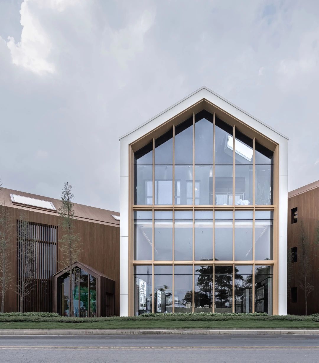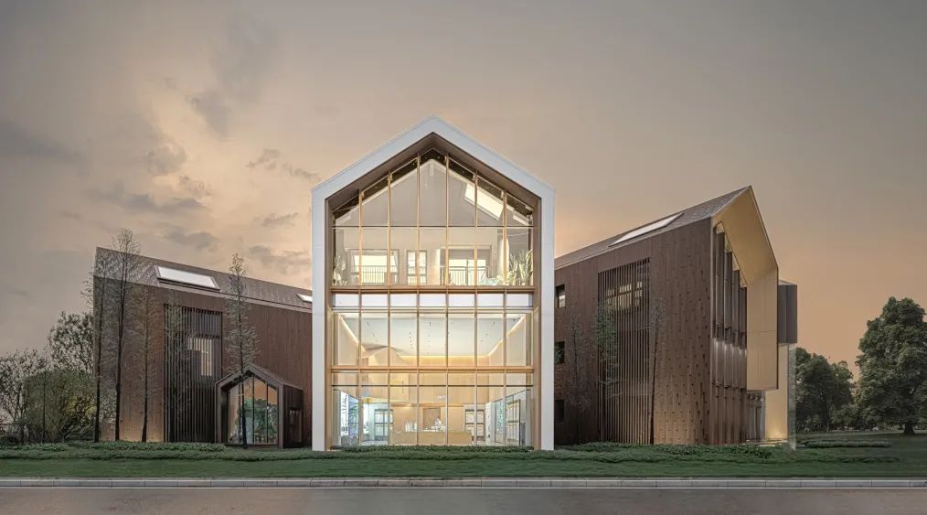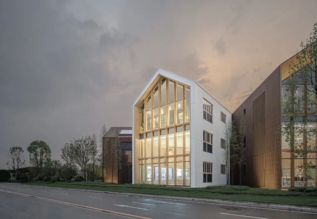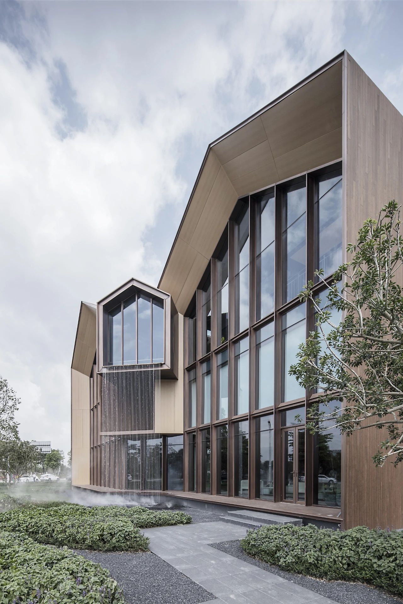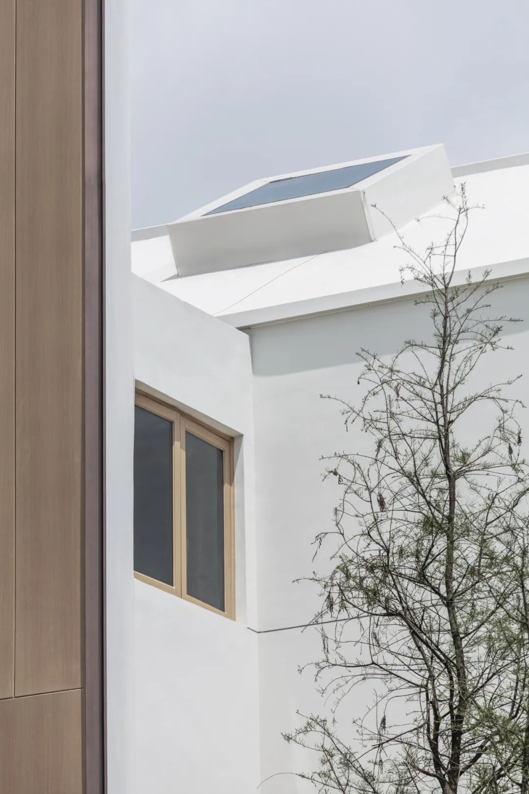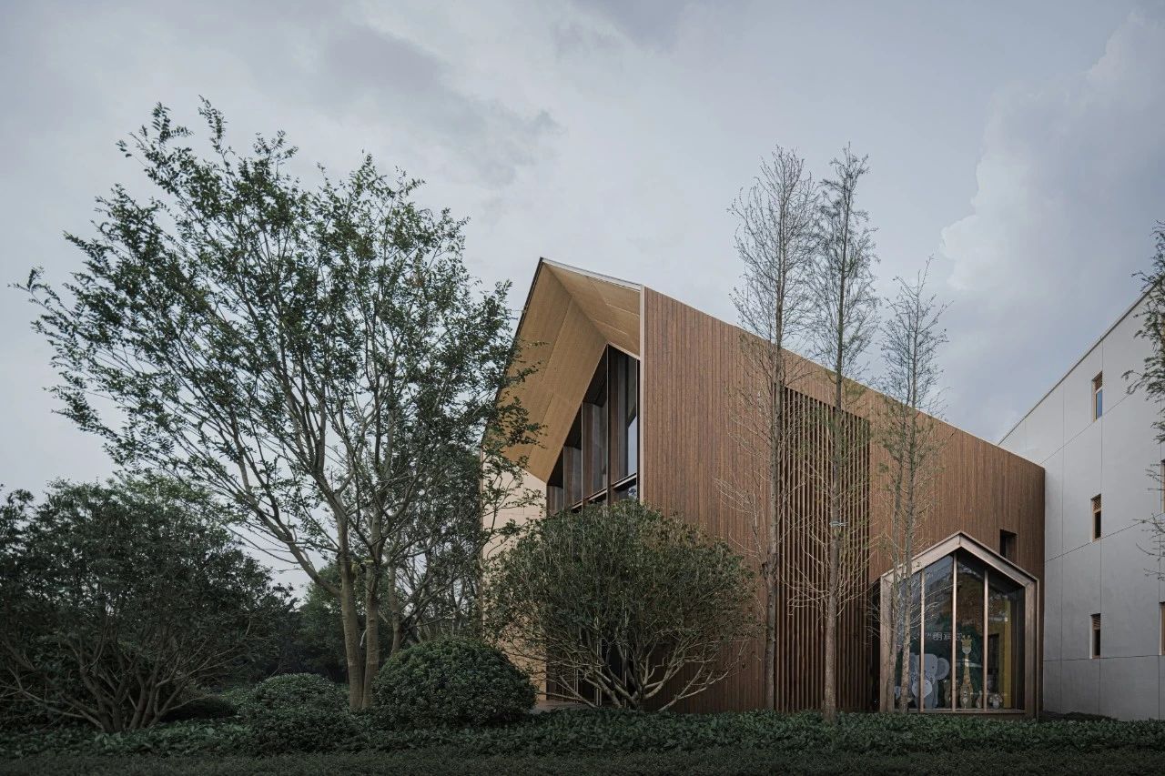 考虑到南侧城市公园与水系的景观资源优势,设计从立面上呼应城市与自然之间的特质,在纯粹的白色涂料基础上搭配竹木材质,取法自然、赋予原生之境,加强亲人感与渗透性。