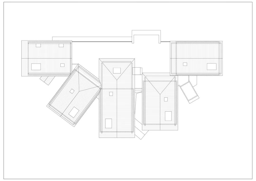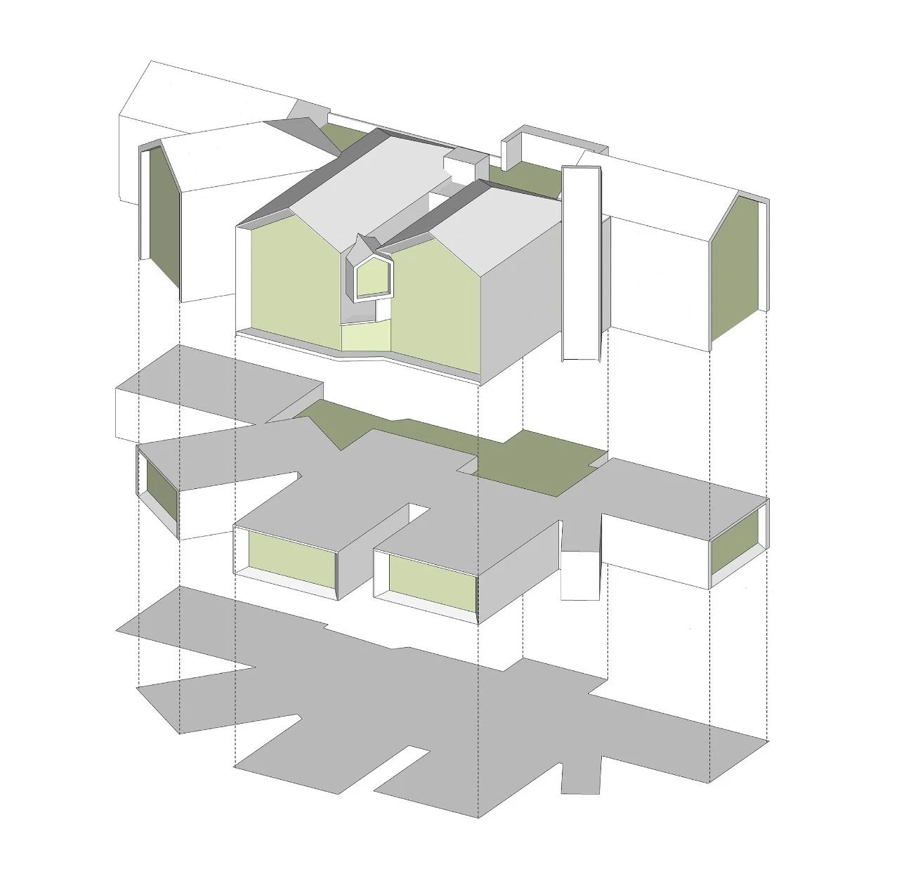 考虑到儿童活动的实用性与日照的渗透性,我们将每一户空间的内天井错落有致的分布在坡屋顶上,营造丰富多彩的光影体验。