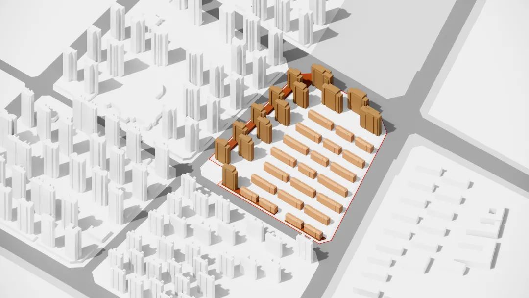 如果说园林式庭院延续了地域性特质,那么建筑立面则成为提炼文脉的重要笔触。我们希望立面的设计不仅呼应基地周边独有的红白相间的肌理表情,同时需尊重城市本土的历史轨迹,抒发居住建筑群落的真情实感。