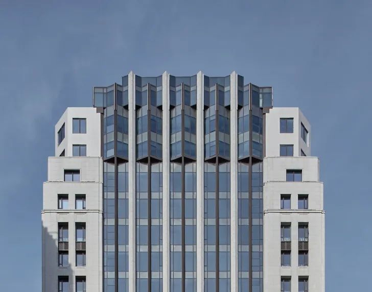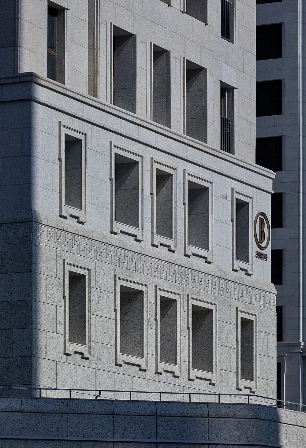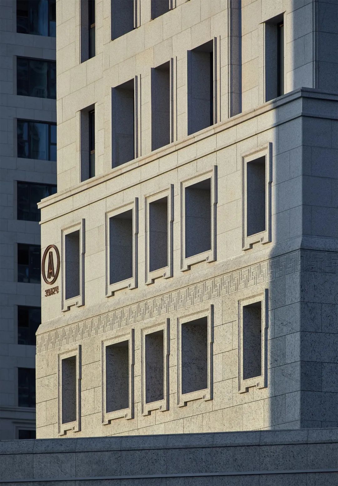 顶部延续古典建筑中水波与钻石的设计概念,摒弃传统造型手法中过于复杂的肌理和装饰线条,以隐喻、抽象的方式刻画对古典的崇拜,使建筑经得起时间的考验。