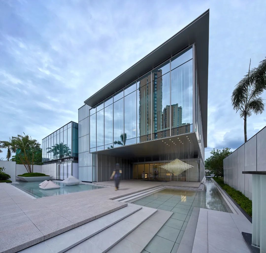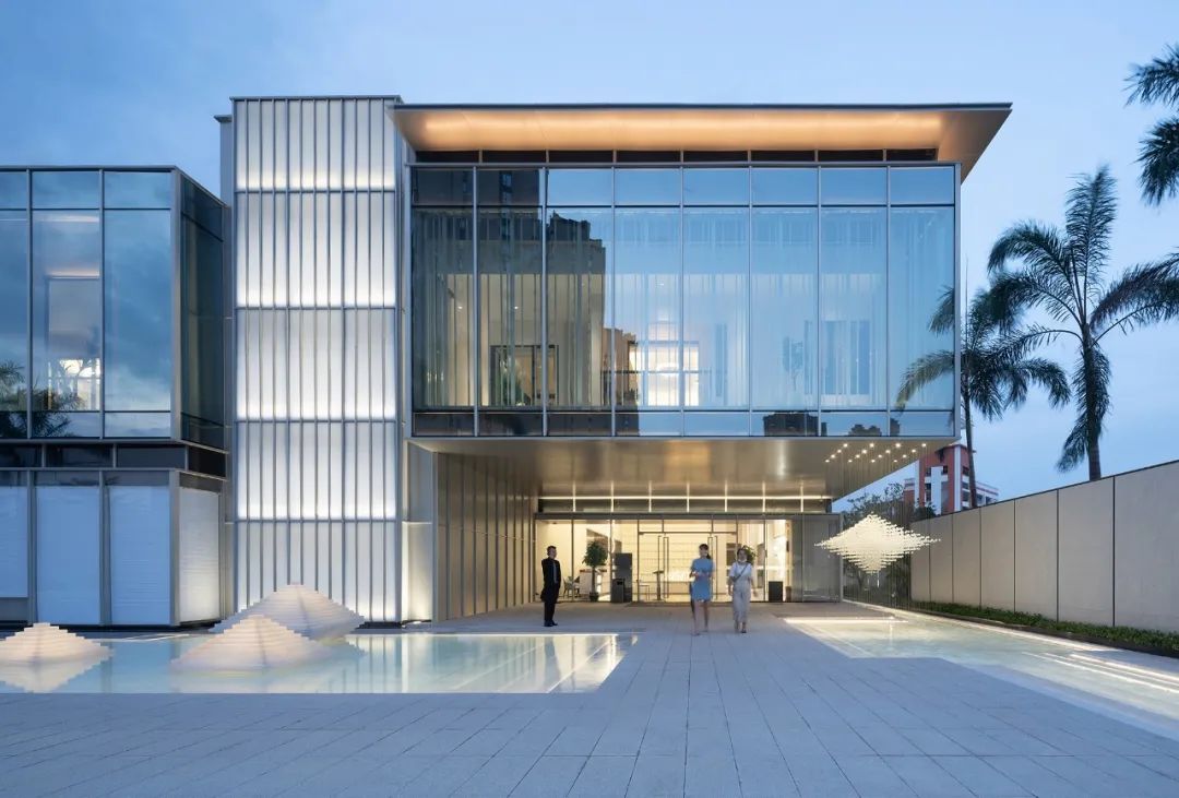 材质的甄选与立面肌理的搭配在整个生活馆的场所营造中也起到了至关重要的作用,我们运用极富现代精致感的建筑材料,茶白、蓝灰色、超白透的玻璃幕墙、银白、薄墨色的铝合金以及爵士白的大理石,在光影变化的过程中彷佛聆听了建筑与场所之间的对话。