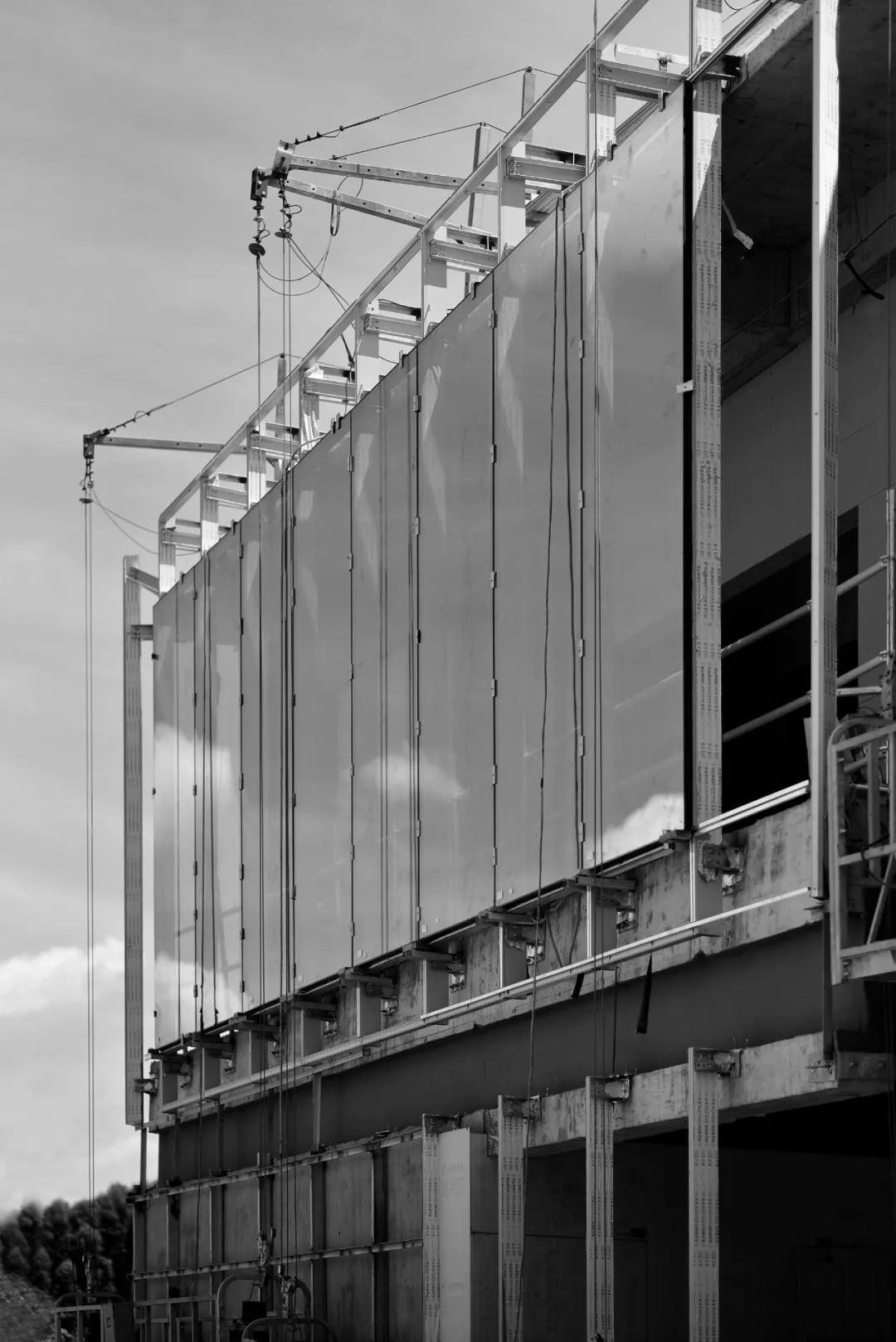 我们在立面的设计中延续建筑的渗透感,通过两层表皮肌理的交织将景观与建筑空间贯通:玻璃幕墙作为第一立面表皮,容纳简约的结构形态与纯粹的立面肌理;穿孔板与格栅以多样的韵律感,半透明的第二表皮丰富了立面整体的节奏。