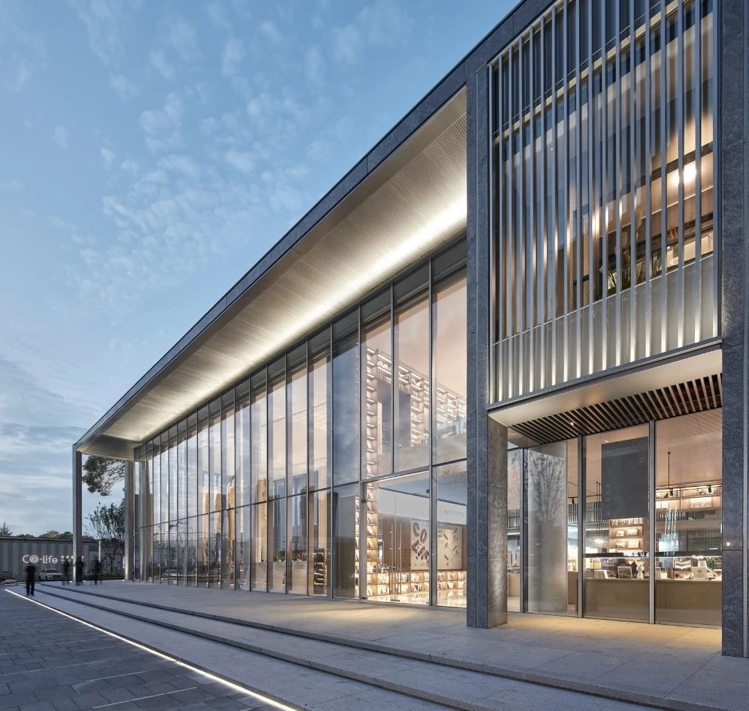 整座建筑中有很多处细节的设计考验,其中颠覆过最多次的便是幕墙细节:最初设计的玻璃尺寸横向四等分、纵向两块,造成了玻璃尺寸超规格,针对比例协调性,我们经过多次修改推敲改为横向五等分、纵向三块,分别与一二层吊顶对齐,分隔形式更合理,提升美感度。