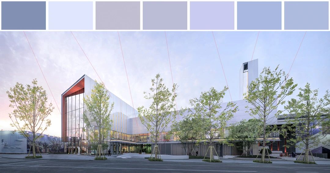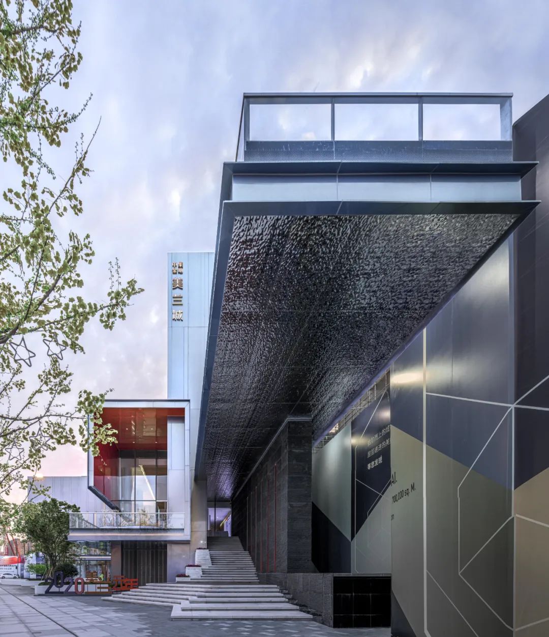 我们最终敲定了蓝幻金的幻彩铝板、玻璃幕墙、混凝土、波纹不锈钢等一系列极具不稳定感的材质组合,让艺术馆在视觉上给人留下更为深刻的魔幻特质与戏剧印象。
