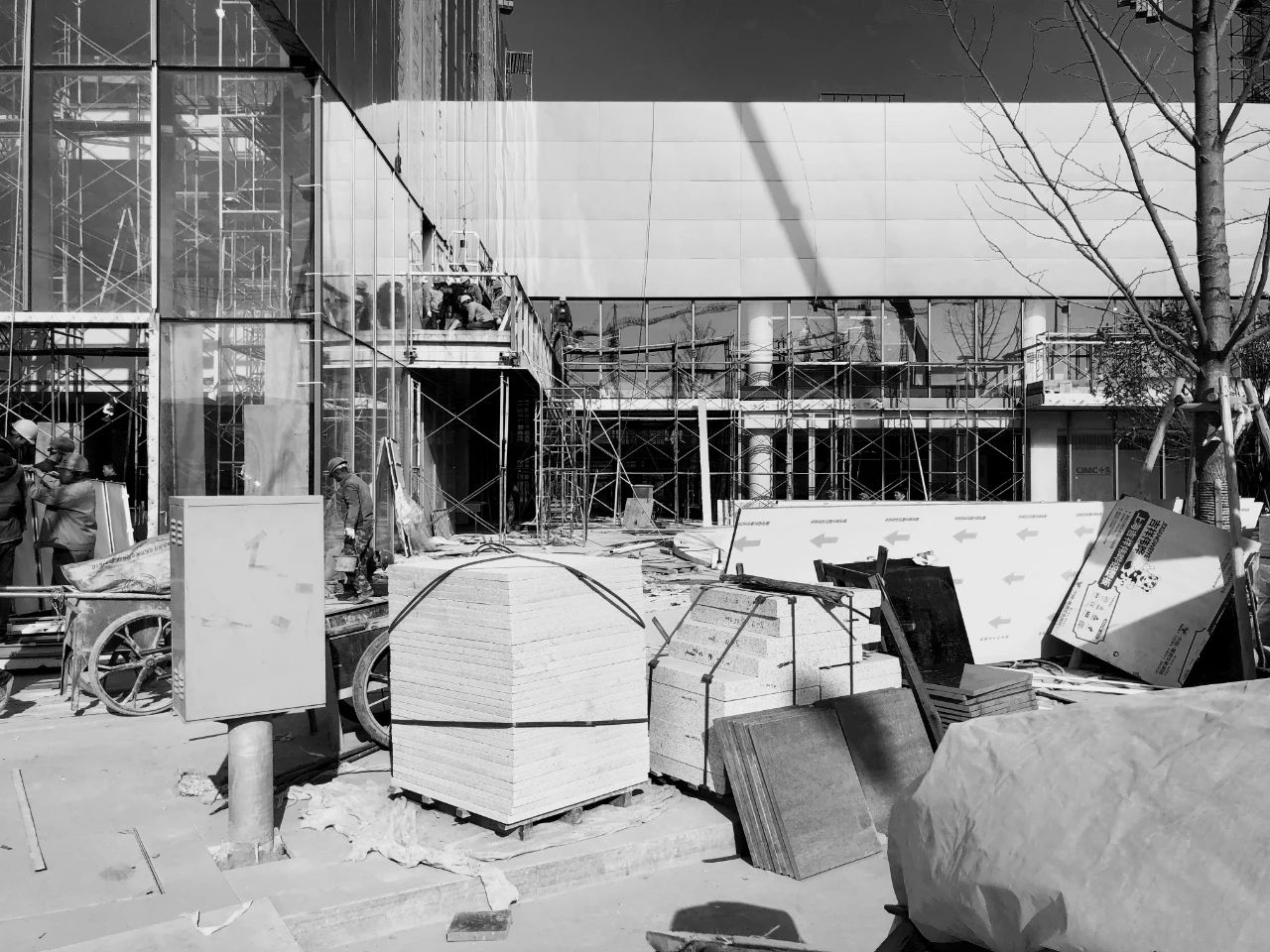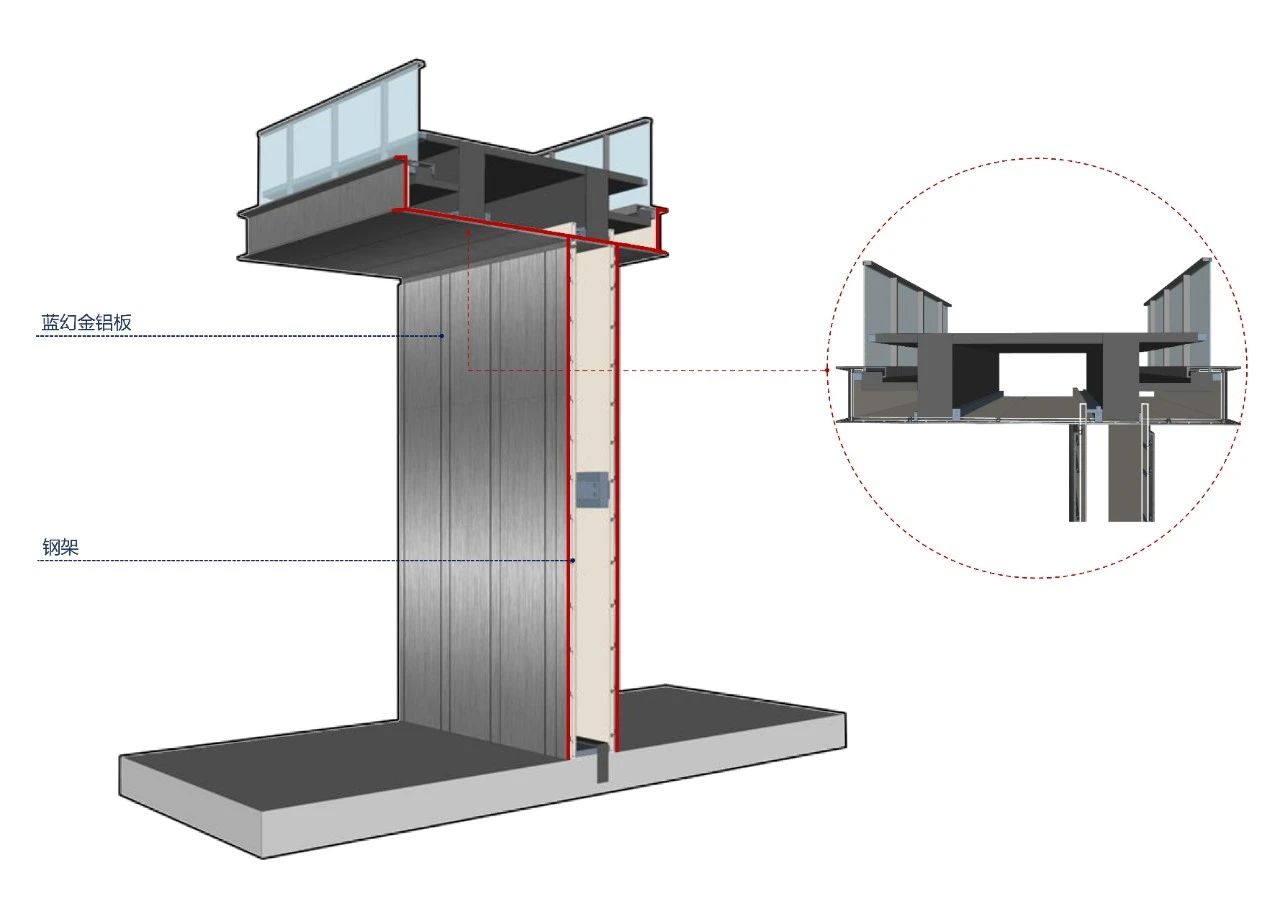 最值得一提的是艺术展厅的正立面铝板幕墙建造,我们经历与结构方反复协调优化,最终实现厚度仅有400mm、高达16m的无柱空间,大大突破了技术极限。