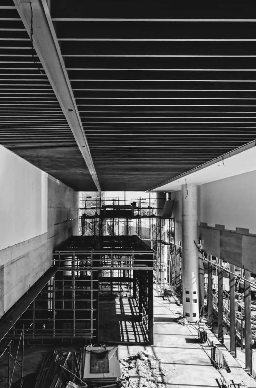 沿着城市大台阶的景观步道,室内外空间的界限并不是通过一道简单的墙来划分。我们积极的将入口灰空间顺应城市客厅的进深尺度,延伸出净高8m、出挑10m的单臂悬挑结构,下方受力支撑的墙身宽度仅为1m。