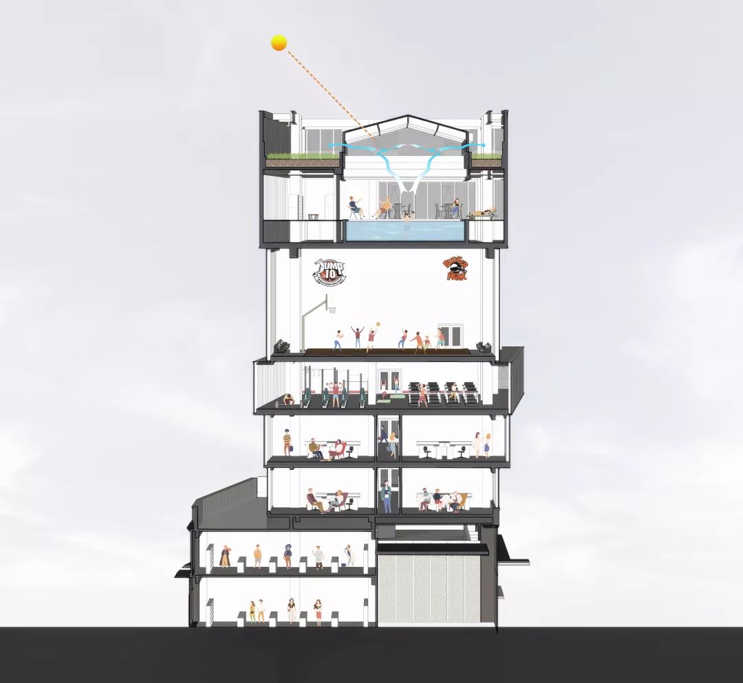 但面对有限的场所与设计范围,为了行之有效的实现社区配套的灵活性,我们也克服了不小的困难与技术难题:为了匹配不同的功能空间,平面布局上进行了错位灵动的体量设计,产生多余的屋面与梁结构通过反复的优化与节点研究;同时32m高空视野的泳池成为吸睛的亮点,其排水处理与自然光天窗的建造细节同样缺少不了持续的调整与尝试。