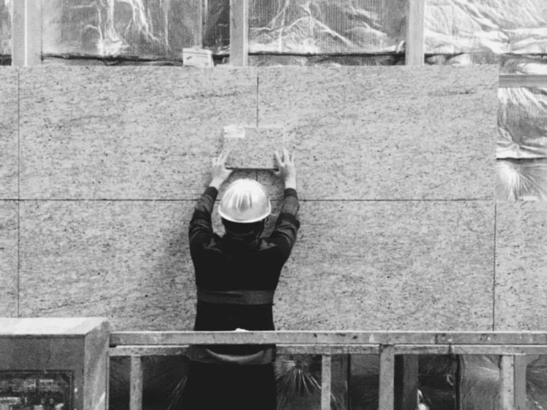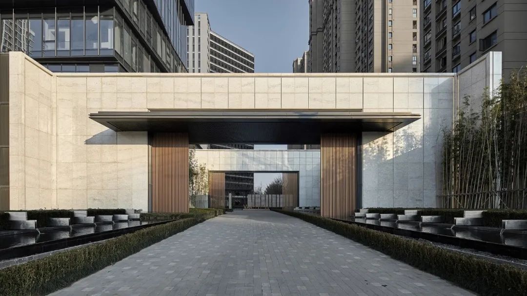 不同于常规的社区大门,我们选用超大尺度、分割规整的石材,尽量减少分缝,从整体上构建出现代简约的入户形象。同时采用28mm厚的蜂窝石材、背衬铝板的工艺,也能够有效保证超大尺寸石材不因较大跨度和气候等因素而产生变形。