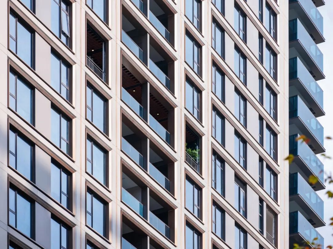进入整个社区院落的第一个落客点同样令人过目不忘,这幢建筑以其“公建化立面”回应社区公共开放的功能。在正面竖挺灰色基调搭配侧面暖木色质感映衬下,将近32米的面宽尺度于近人体验感中被削弱,以通透明朗的界面与城市场景产生对话。