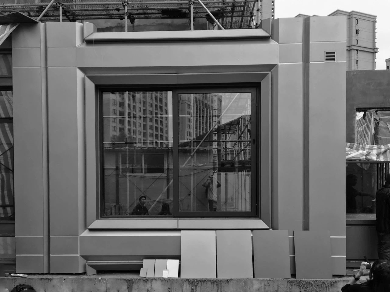 社区住宅建造过程中最值得重点关注的是关于楔形窗套的推敲,我们根据龙骨的比例与尺度,弧面变成直角等细节,现场搭建再重构了几轮窗套,最终实现了最平整、线条感最优化的方案。