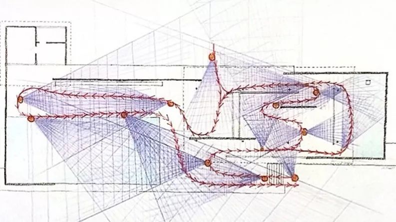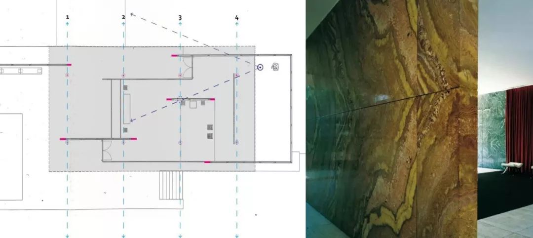 人在巴塞罗纳德国馆中游走时,总面临选择接下来通向哪里这个问题。空间被人的行走激活,空间的节奏感被人的步伐所赋予。
