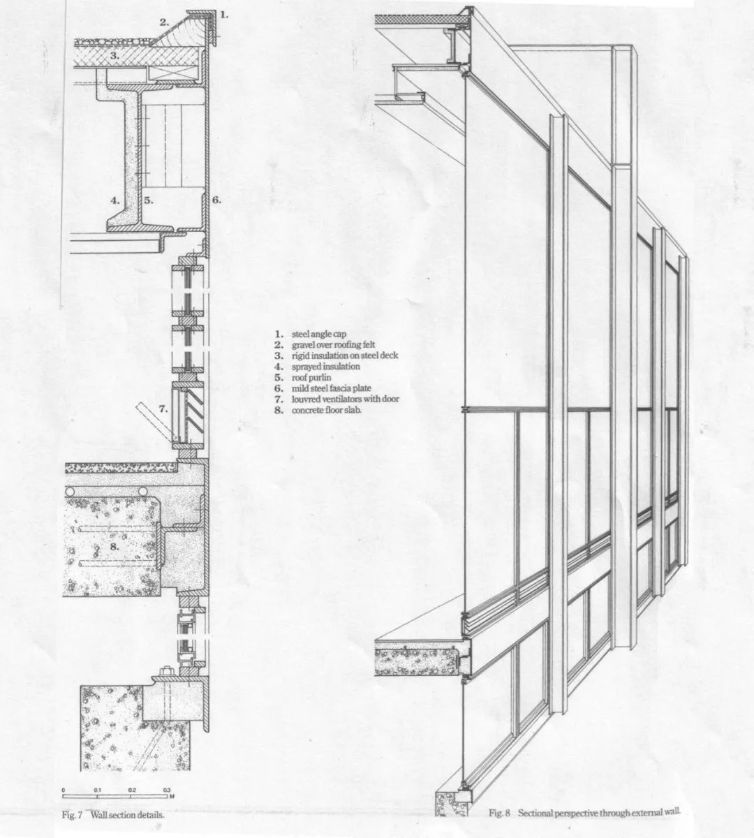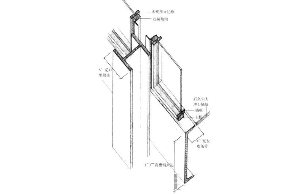 密斯常倾向于对节点的连接进行弱化处理。如柱与板采取平焊术(flat welds)。建筑并没有表现出荷载的传递关系,也没用像康一样将建筑组合的过程的痕迹作为装饰的元素。